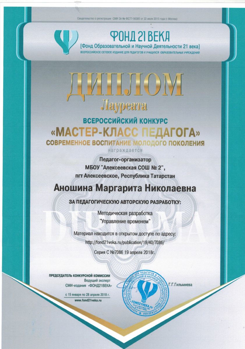 ► Всероссийский конкурс "Мастер-класс педагога. Современное воспитание молодого поколения", Аношина М.Н., Диплом лауреата, апрель 2018