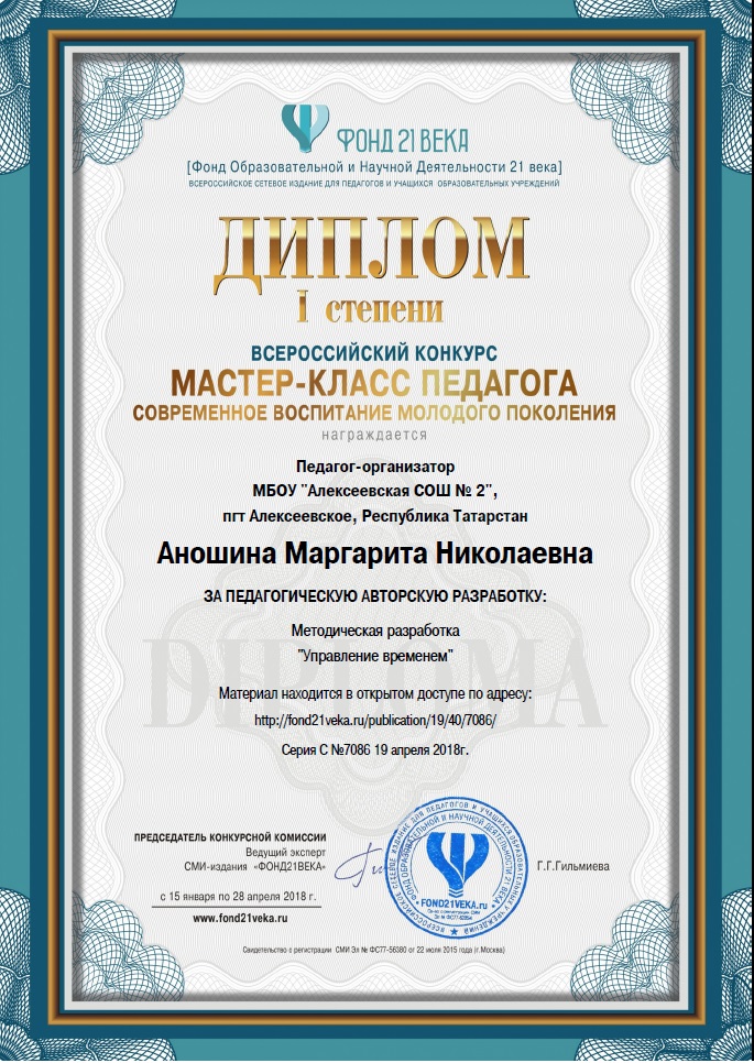 ► Всероссийский конкурс "Мастер-класс педагога. Современное воспитание молодого поколения", Аношина М.Н., Диплом 1 степени, апрель 2018
