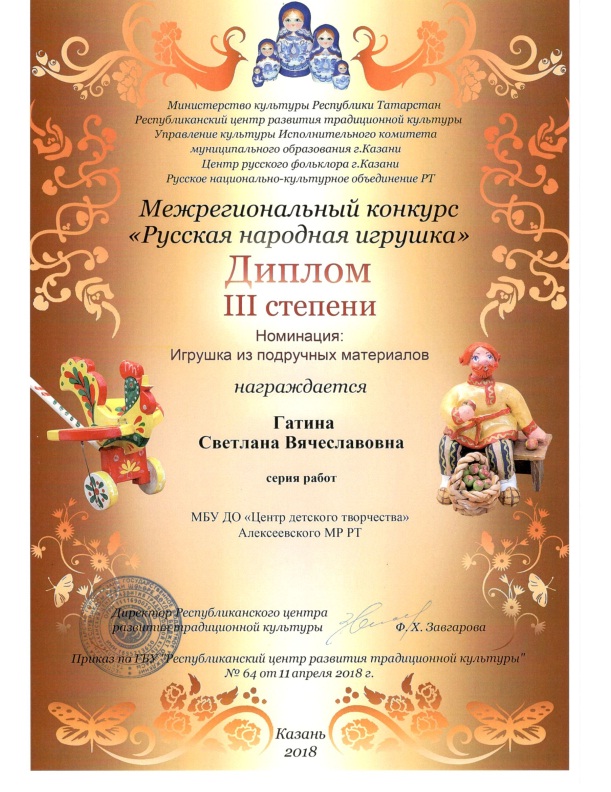 ► Межрегиональный конкурс "Русская народная игрушка", Гатина С.В., Диплом 3 степени, апрель 2018