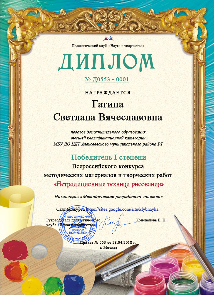 ► Всероссийский конкурс методических материалов и творческих работ "Нетрадиционные техники рисования", Гатина С.В., Диплом 1 степени, апрель 2018
