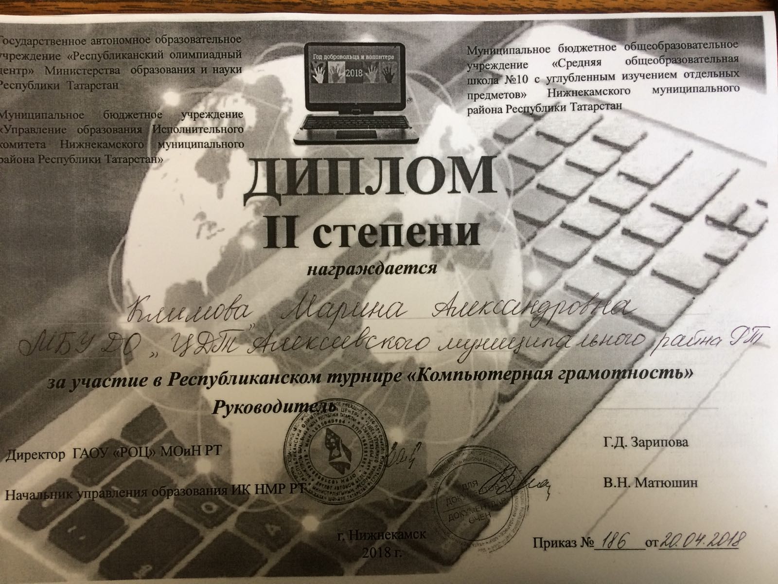 ► Республиканский турнир "Компбютерная грамотность", Диплом 2 степени, Климова М.А., апрель 2018