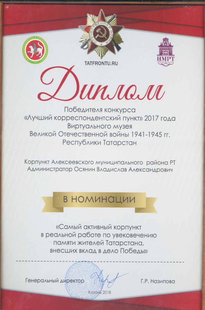 ► Конкурс "Лучший корреспондентский пункт", Осянин В.А., Диплом победителя, май 2018