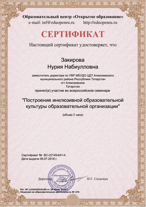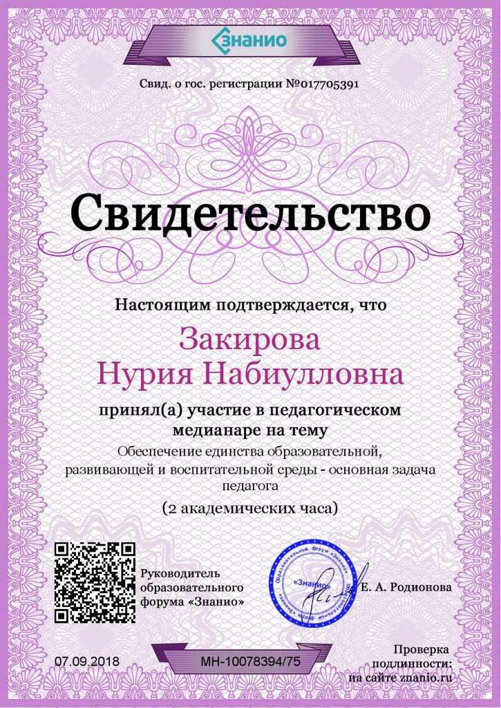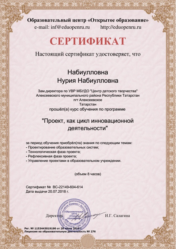 ► Курс обучения "Проект, как цикл инновационной деятельности", Закирова Н.Н., Сертификат, июль 2018