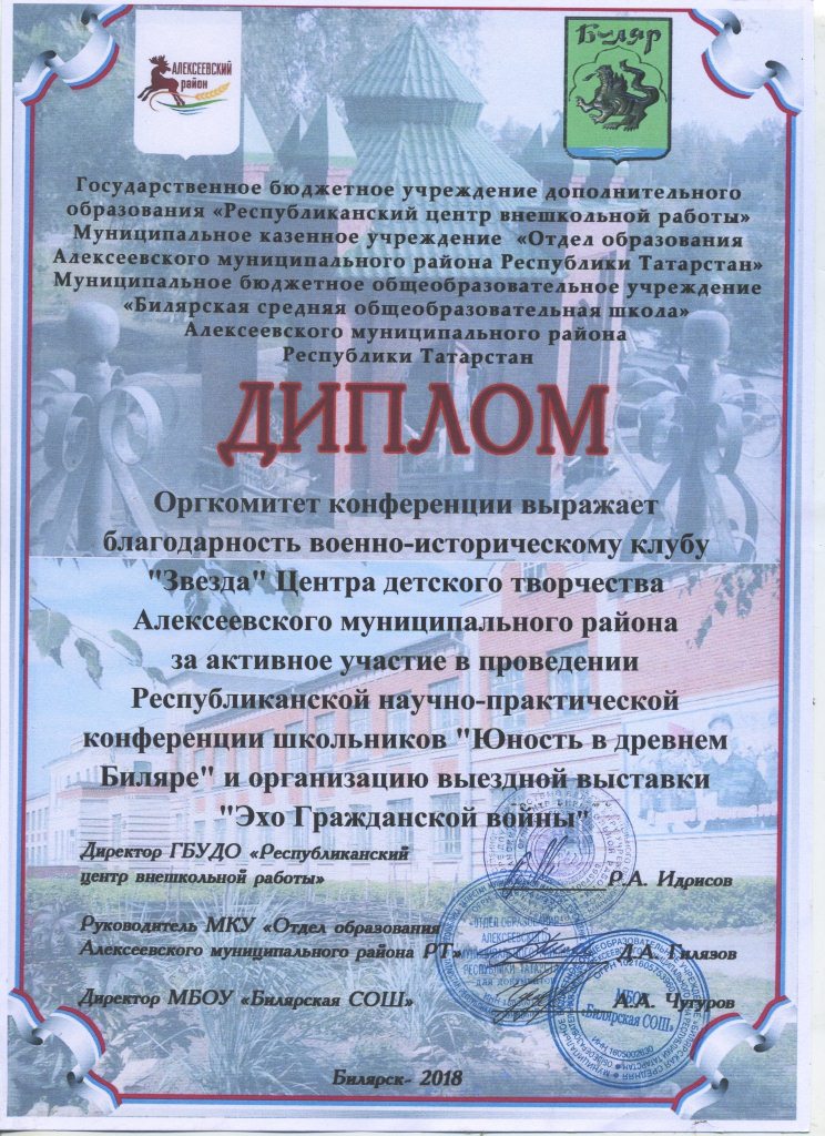 ► Республиканская научно-практическая конференция школьников "Юность в древнем Биляре", Диплом