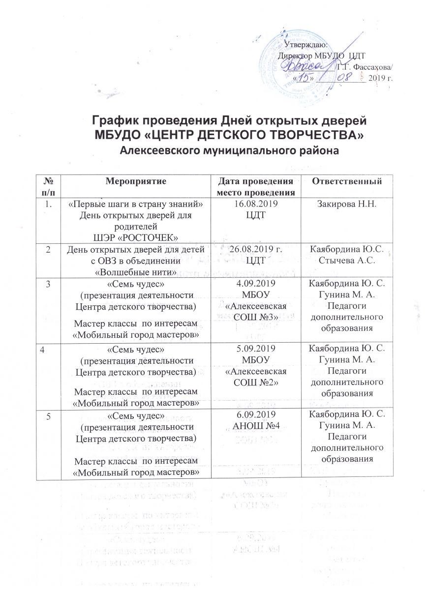 Опубликовано: 14.08.2019В целях формирования эффективного партнерства с родительской общественностью, а также обеспечения оперативного получения актуальной информации о реализуемых программах дополнительного образования с 15 августа по 10 сентября 2019 года в Центре детского творчества проводятся Дни открытых дверей согласно графика: