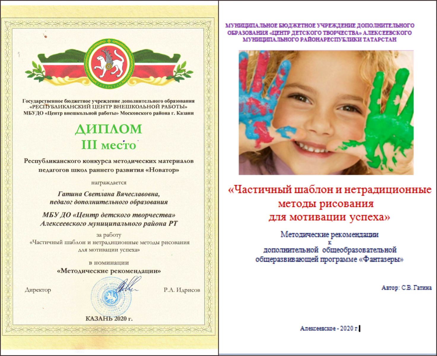 Опубликовано: 14.03.2020Педагог дополнительного образования Гатина Светлана Вячеславовна приняла участие в республиканском конкурсе методических материалов педагогов школ раннего развития «Новатор» с авторской разработкой методических рекомендаций по теме: «Частичный шаблон и нетрадиционные методы рисования для мотивации успеха» и стала призером, заняв третье место.