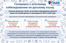 Итоговое собеседование в 2019/2020 учебном году проводится 12 февраля 2020 года (во вторую среду февраля). В случае получения неудовлетворительного результата («незачет») за итоговое собеседование обучающиеся, экстерны вправе пересдать итоговое собеседование в текущем учебном году, но не более двух раз и только в дополнительные сроки, предусмотренные расписанием проведения итогового собеседования – 11 марта 2020 года (во вторую рабочую среду марта) и 18 мая 2020 года (первый рабочий понедельник мая). Для участия в итоговом собеседовании обучающиеся подают заявление и согласие на обработку персональных данных в образовательные организации, в которых обучающиеся осваивают образовательные программы основного общего образования, а экстерны – в организации, осуществляющие образовательную деятельность по имеющим государственную аккредитацию образовательным программам основного общего образования, по выбору экстернов не позднее чем за две недели до начала проведения итогового собеседования. Подробнее...