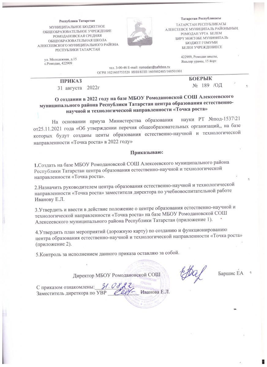 Приказ о создании в 2022 году центра "Точка роста" и назначении ответственного