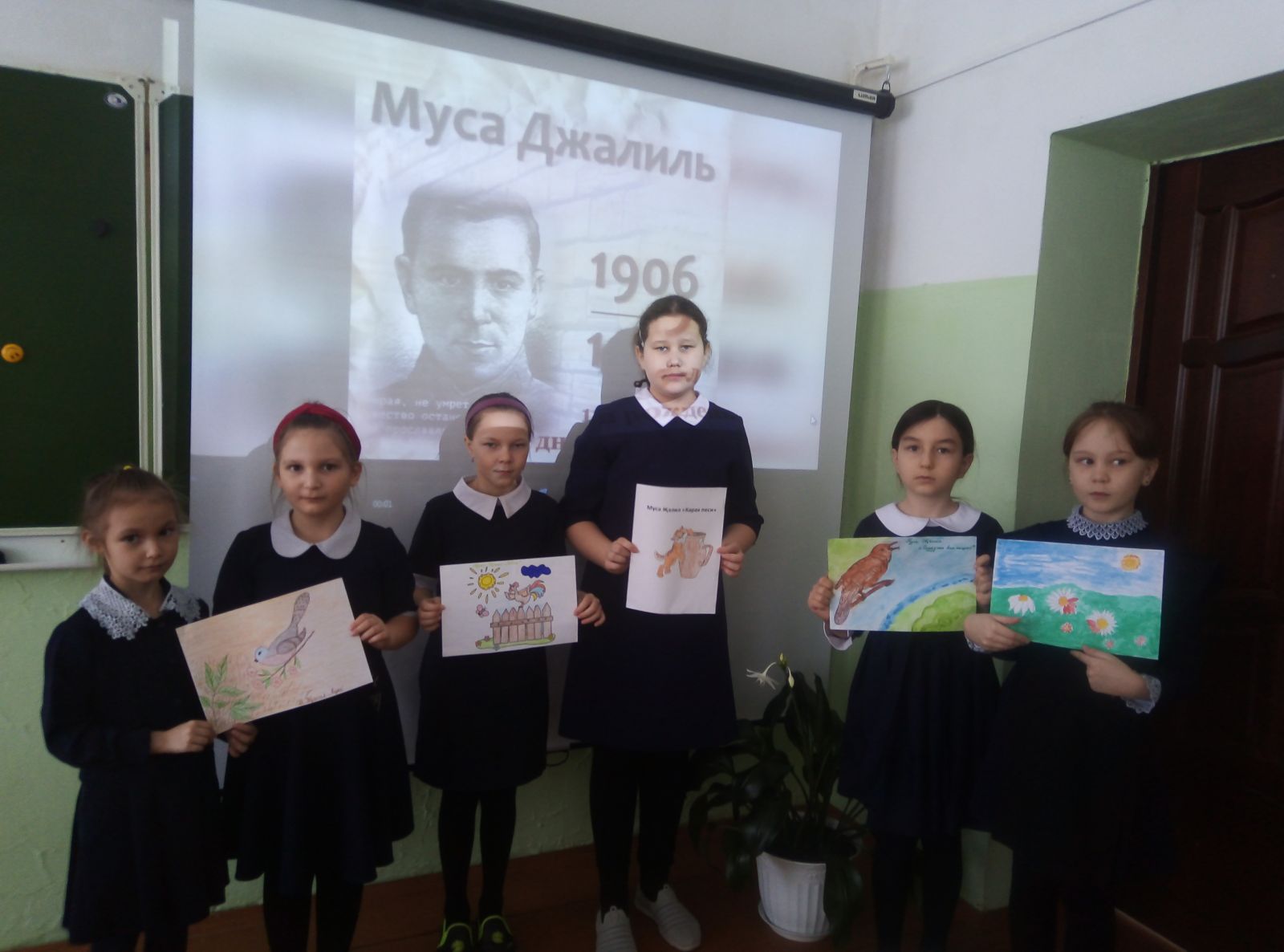 15 февраль - Муса Җәлилне искә алу көне.Шул уңайдан башлангыч сыйныфта "Муса Җәлил - балаларның дусты" дип аталган кичә үтте.Кичәдә укучылар язучының шигырьләрен сәнгатьле итеп сөйләделәр ,иллюстрацияләр ясадылар,презентация карадылар.Кичә дәвамында укучылар күп мәгълүмат алдылар.
