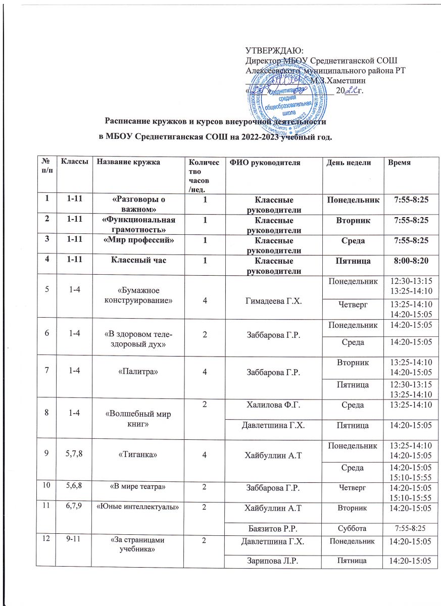 Расписание внеурочной деятельности 5-11 классов по МБОУ Среднетиганской СОШ в 2021-2022 учебном году