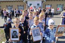 В память о тех, кто погиб, и о тех, кто вернулся с войны, дети, внуки и правнуки военного поколения проходят торжественным маршем и несут транспаранты с фотопортретами родственников, участвовавших в Великой Отечественной войне.