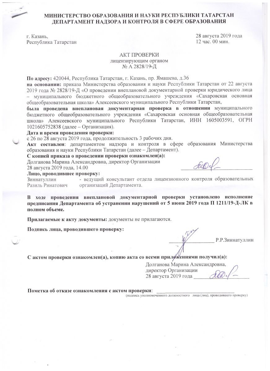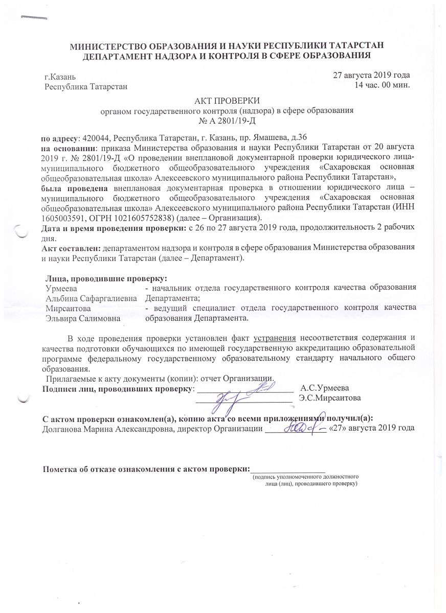 АКТ ПРОВЕРКИ ДЕПАРТАМЕНТА НАДЗОРА И КОНТРОЛЯ В СФЕРЕ ОБРАЗОВАНИЯ
