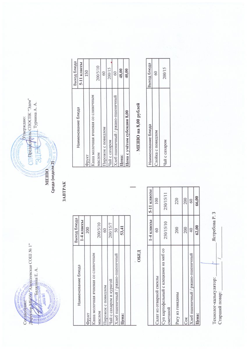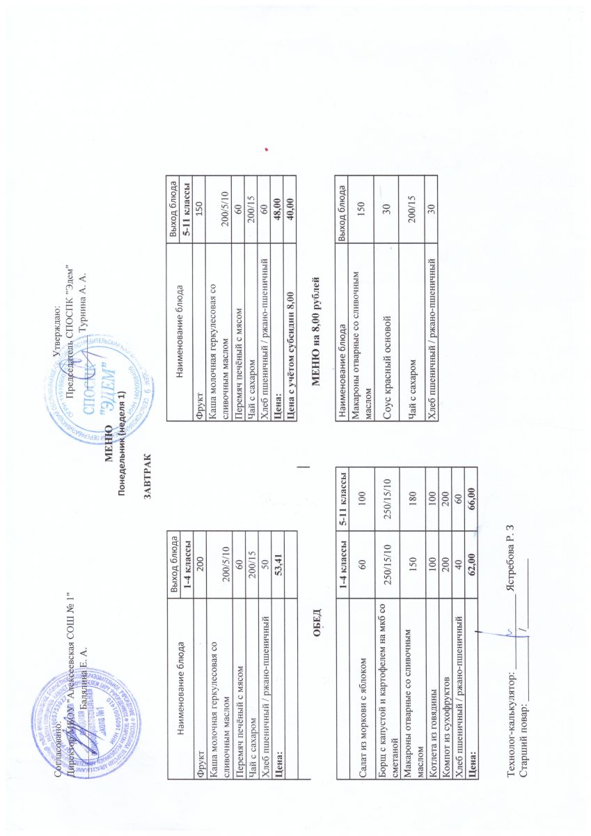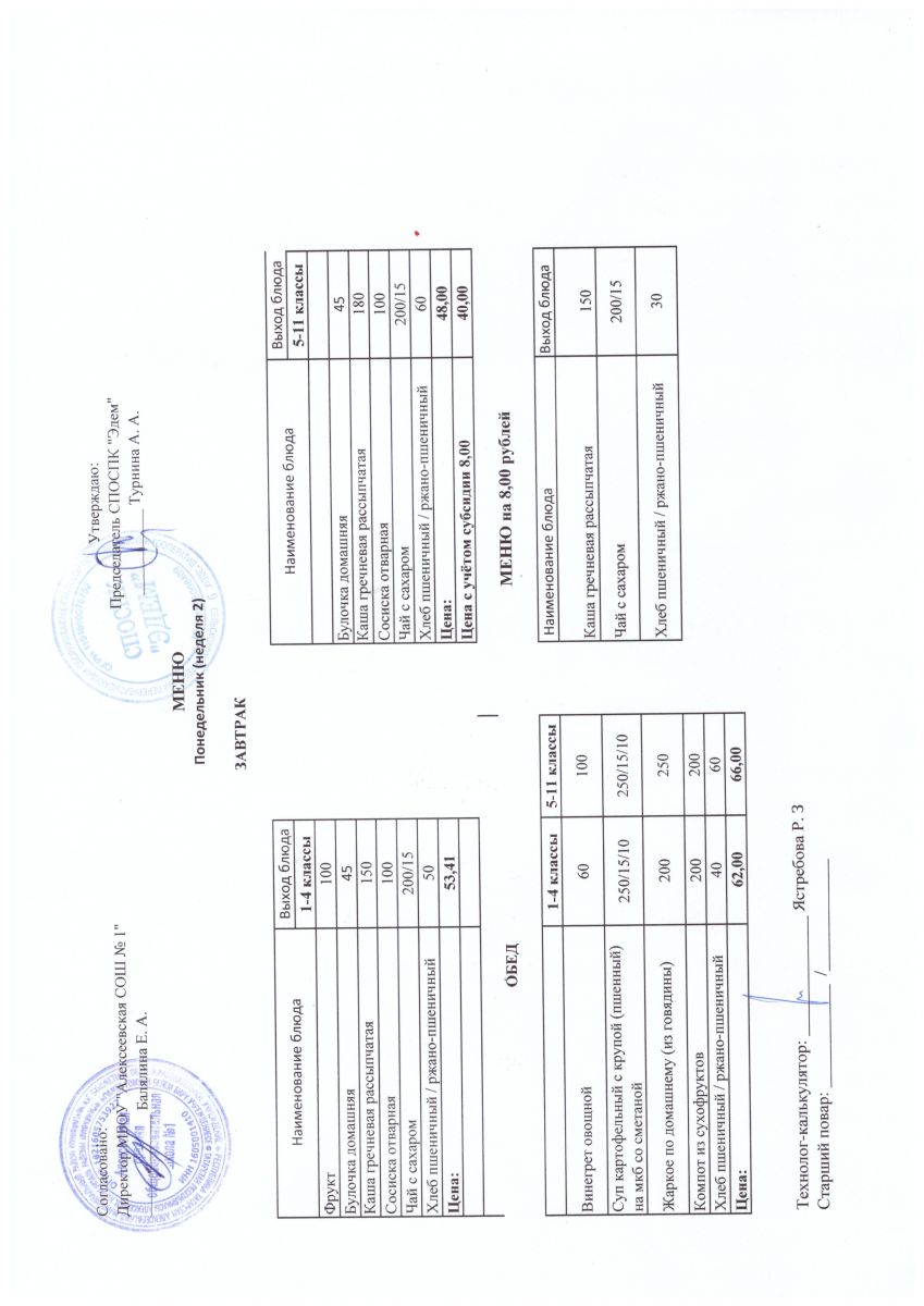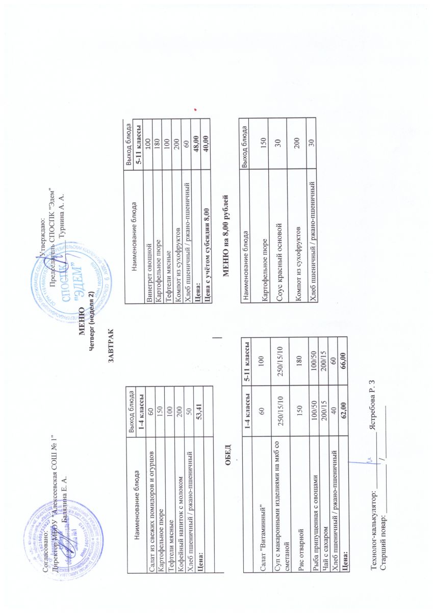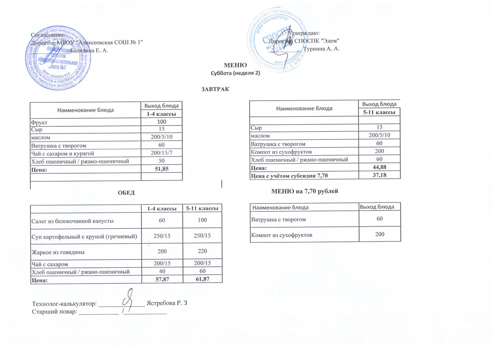 Примерное двухнедельное меню для учащихся 1-4 классов на первое полугодие 2021-2022 учебный год