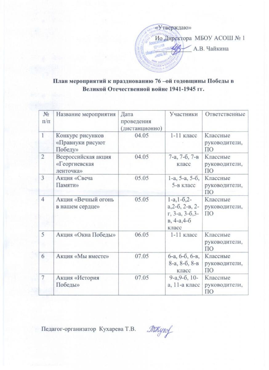 План мероприятий к празднованию 76-ой годовщины Победы в Великой Отечественной войне на май 2021
