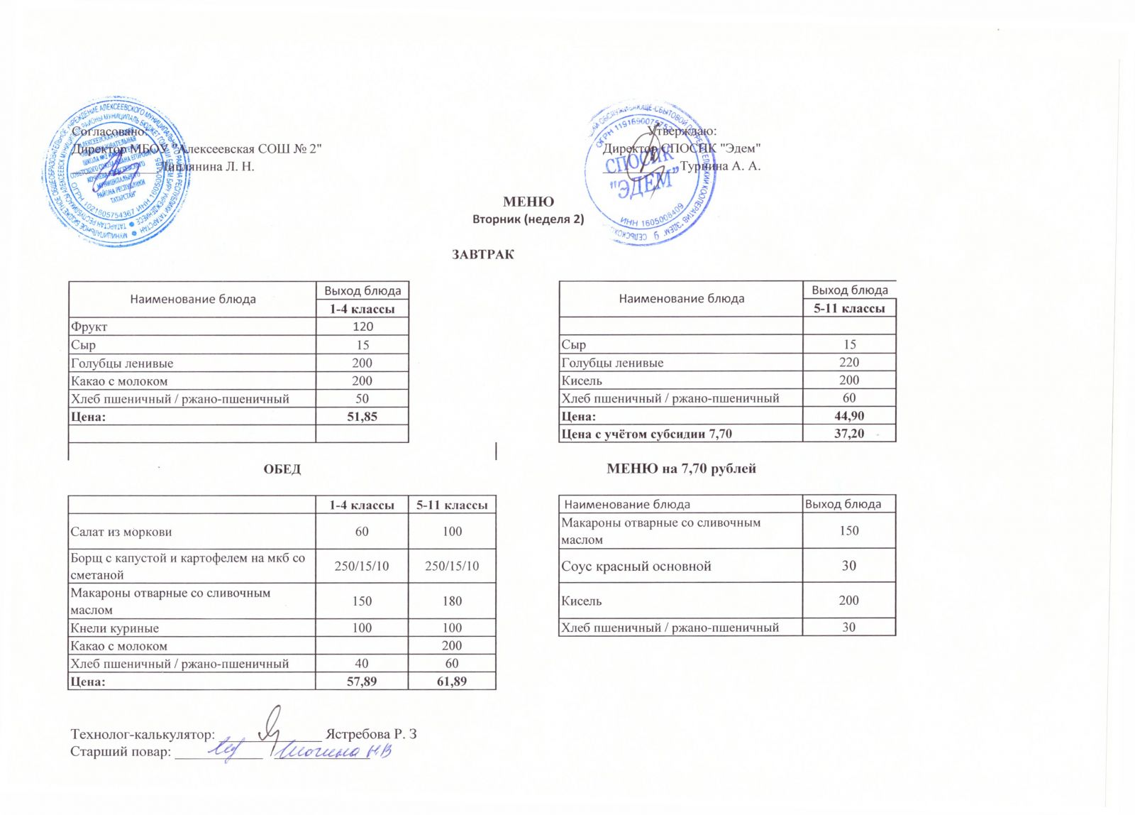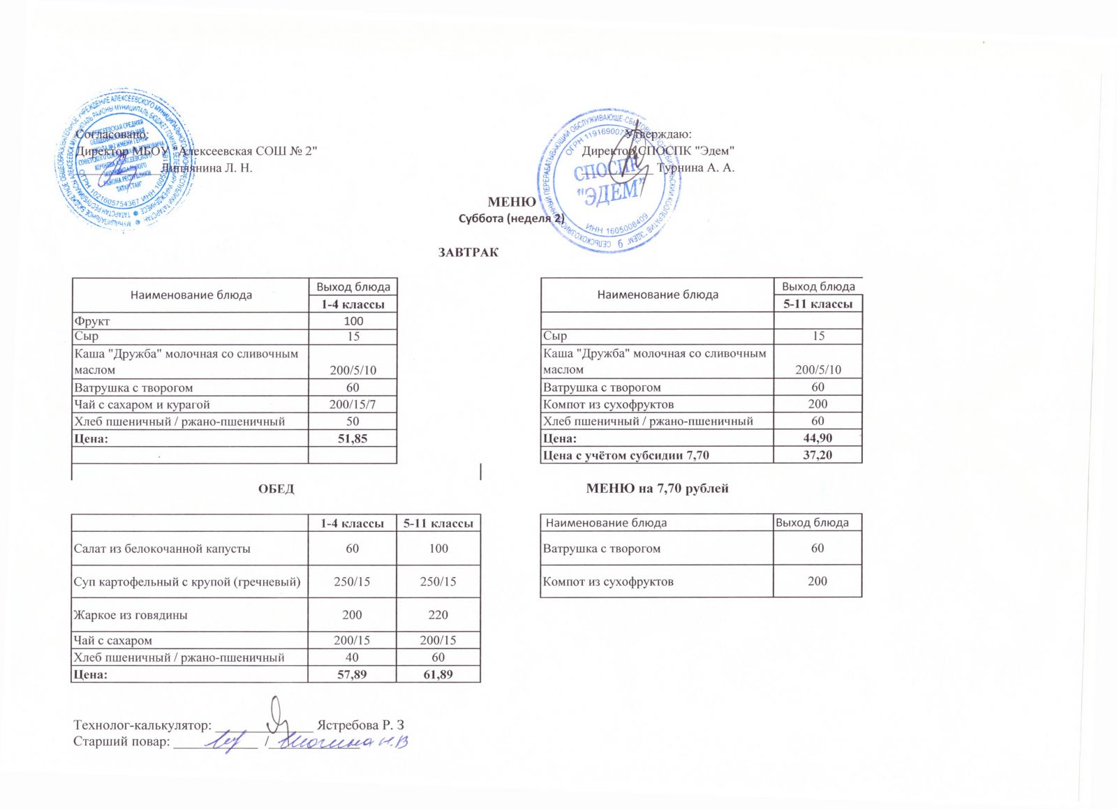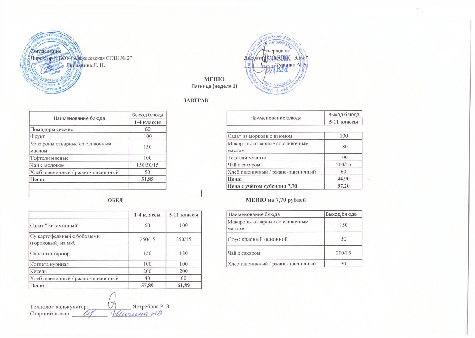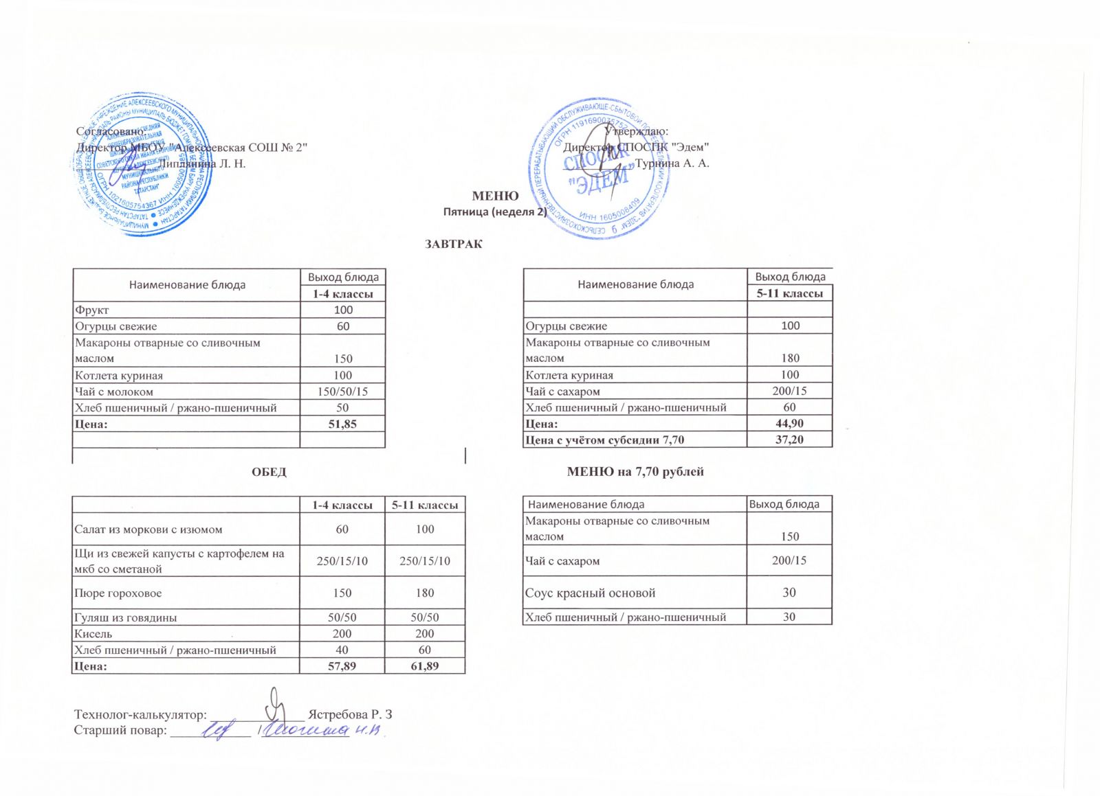 Меню МБОУ "Алексеевская СОШ №2" на 1 неделю
