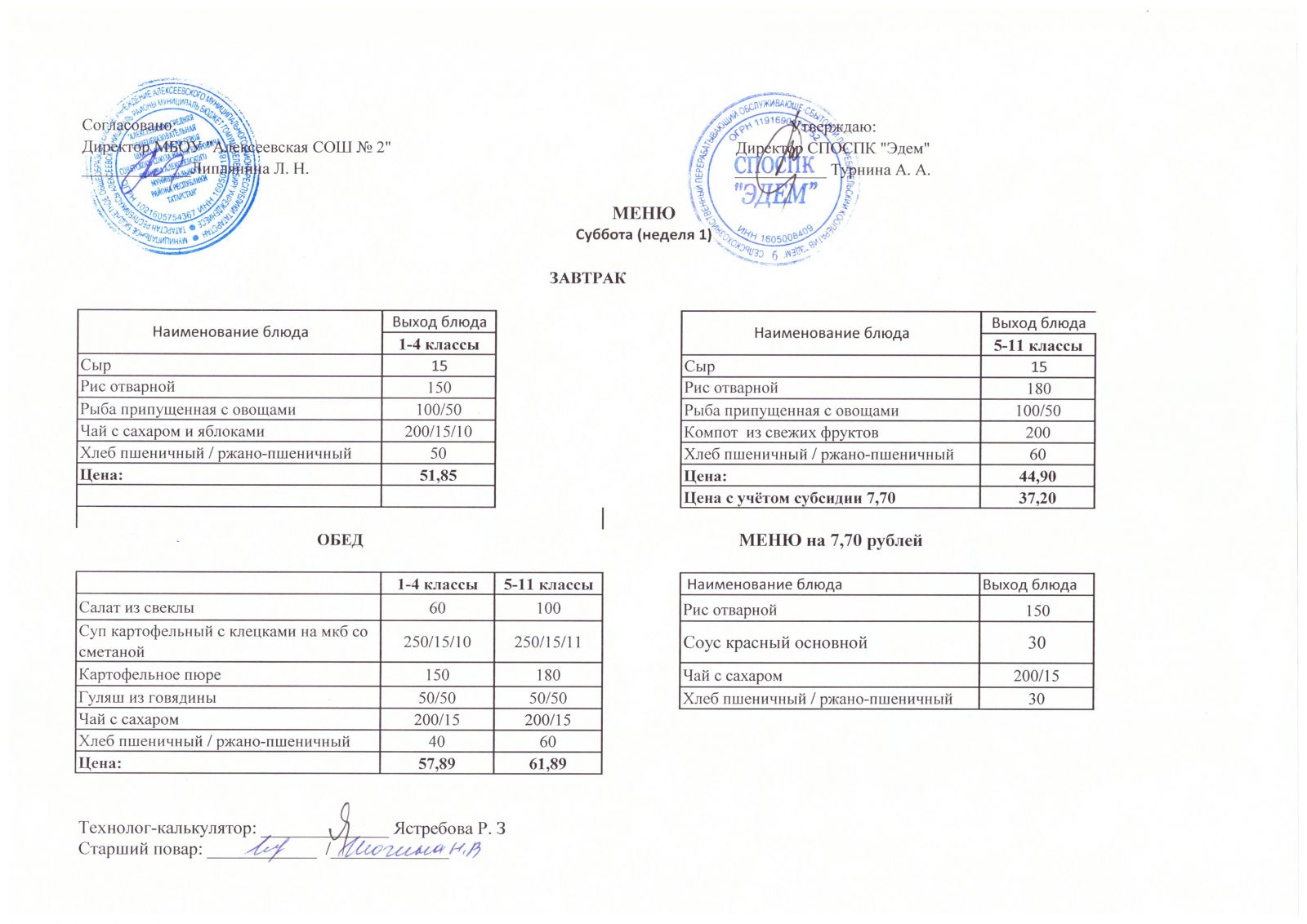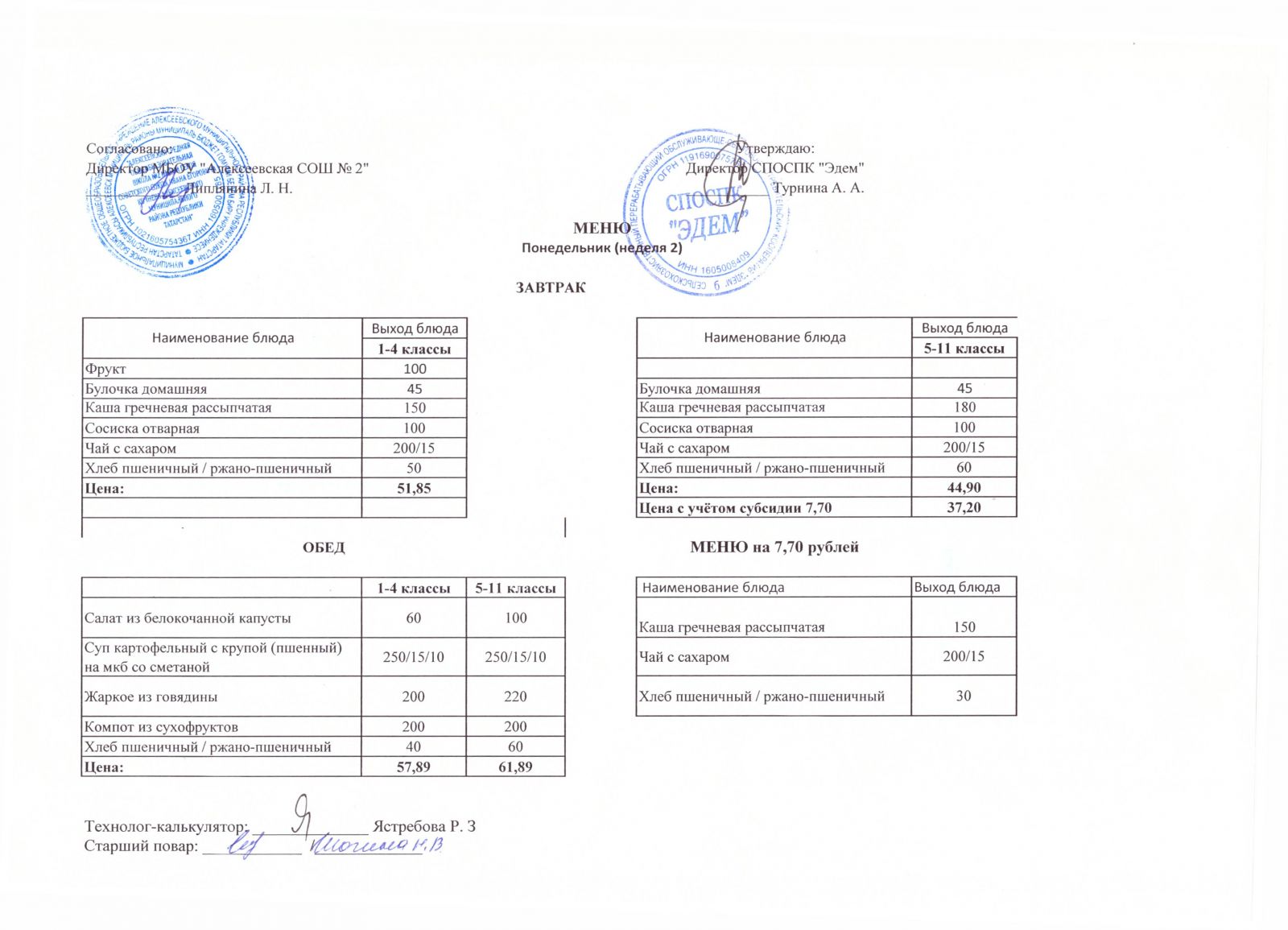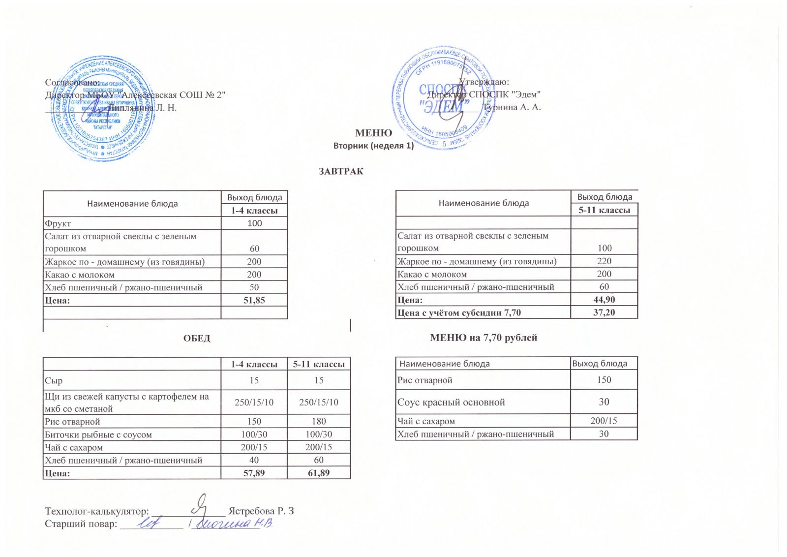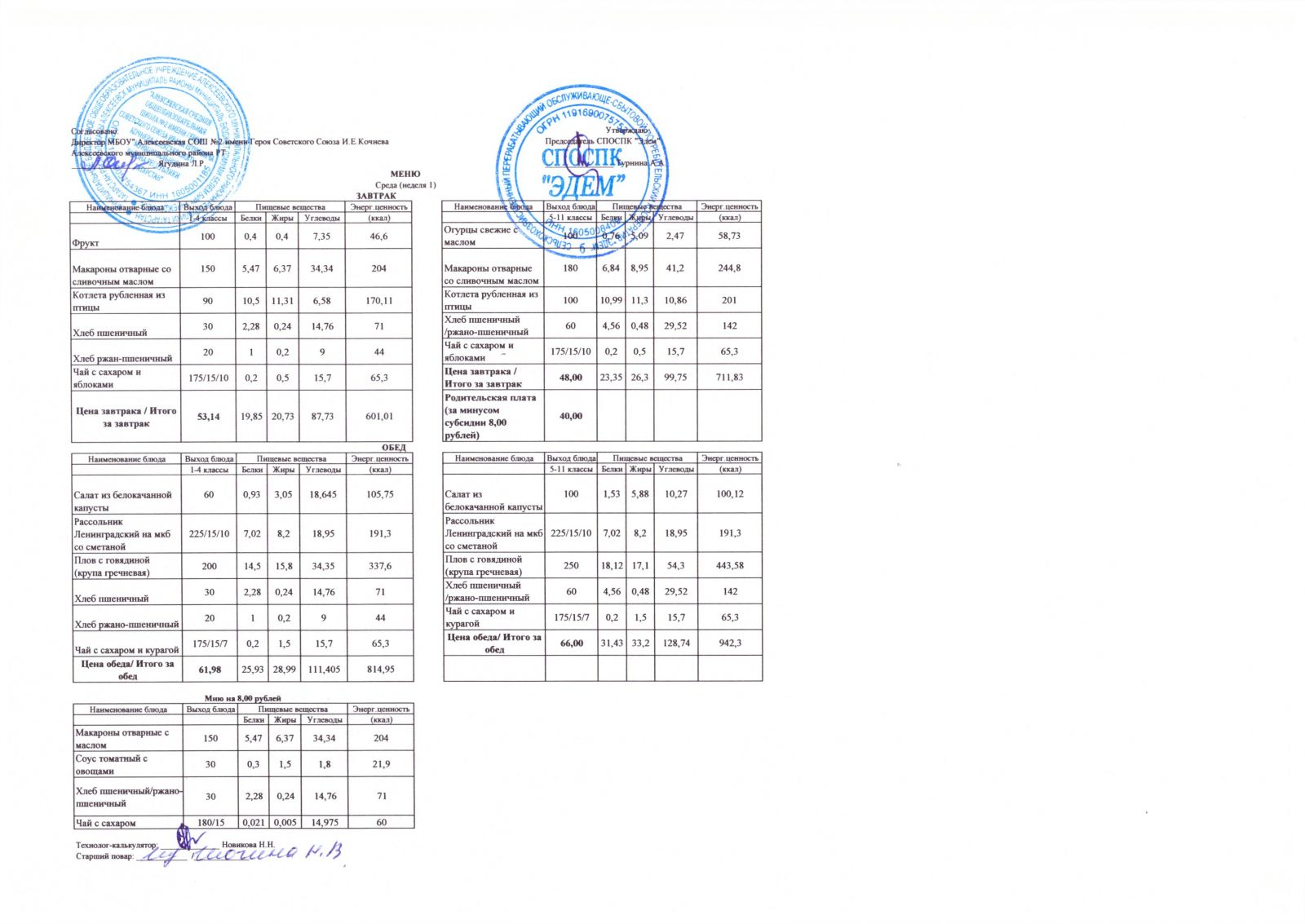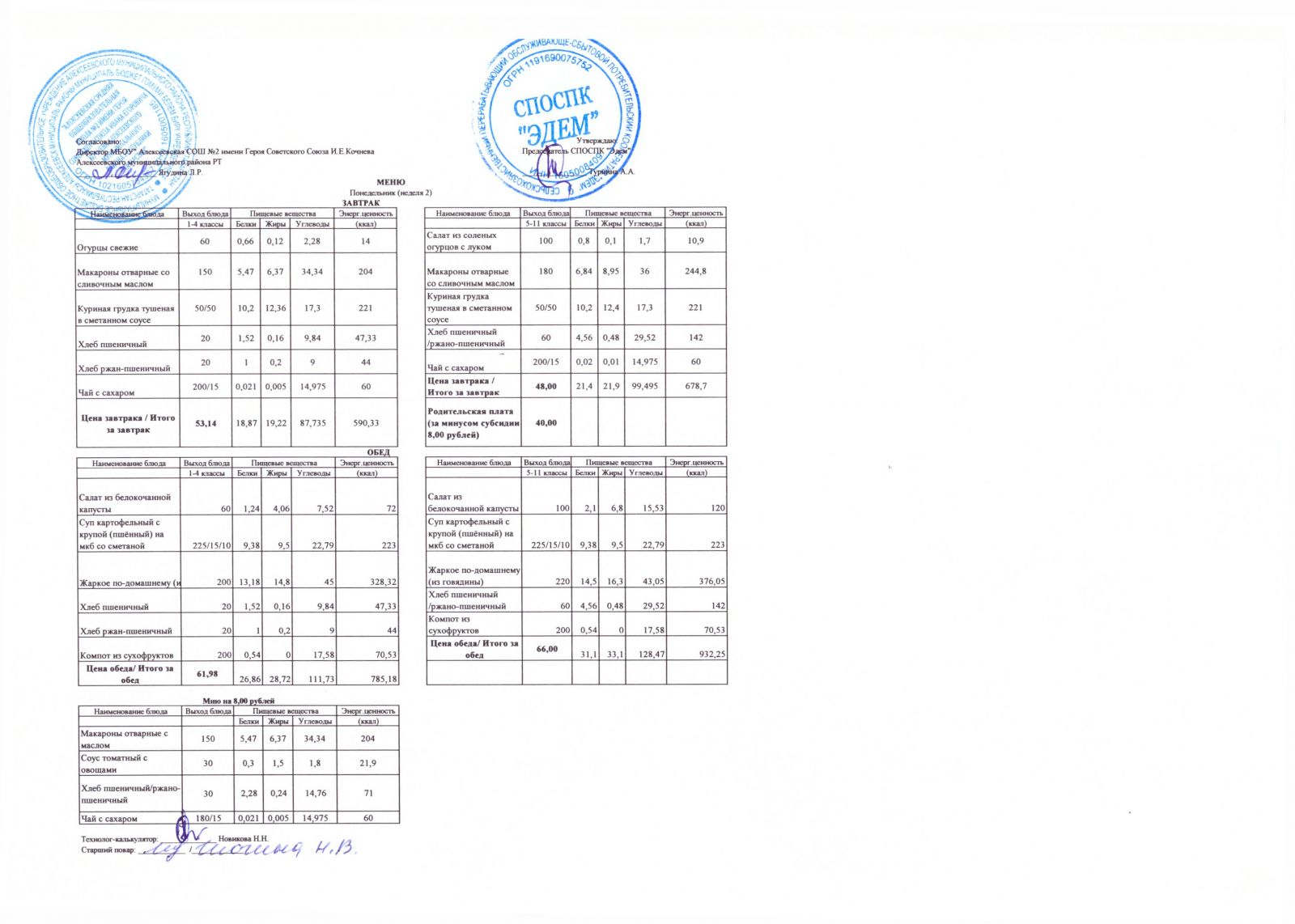 Меню МБОУ "Алексеевская СОШ №2" на 1 неделю