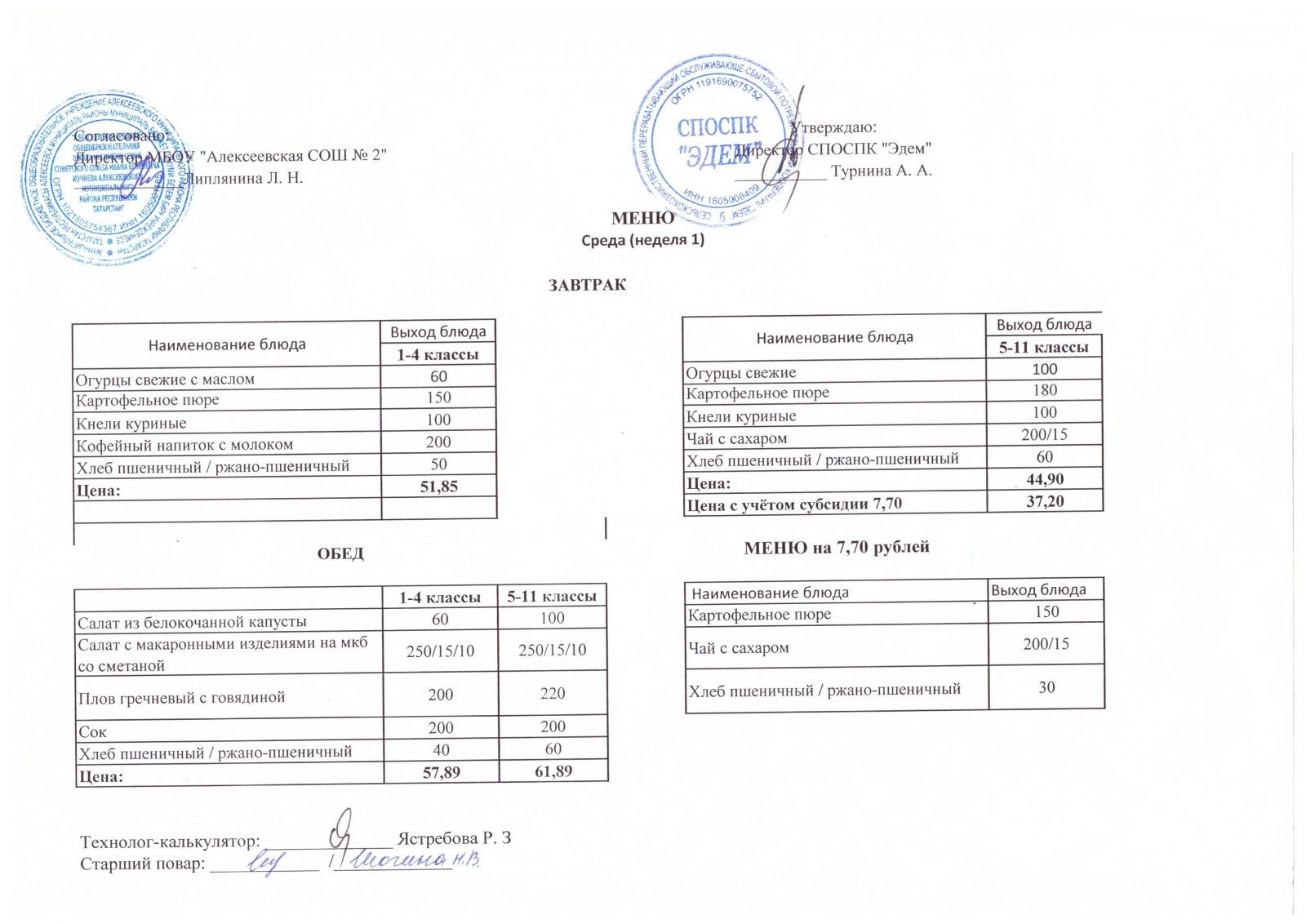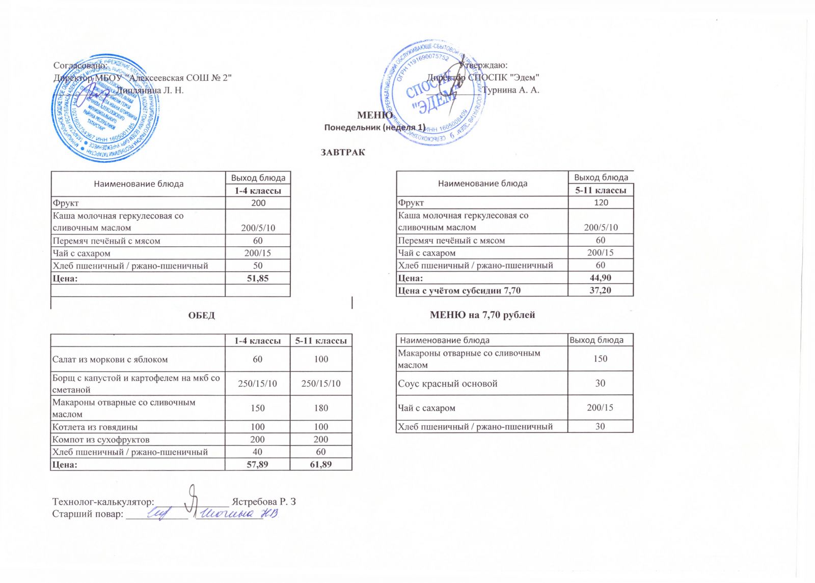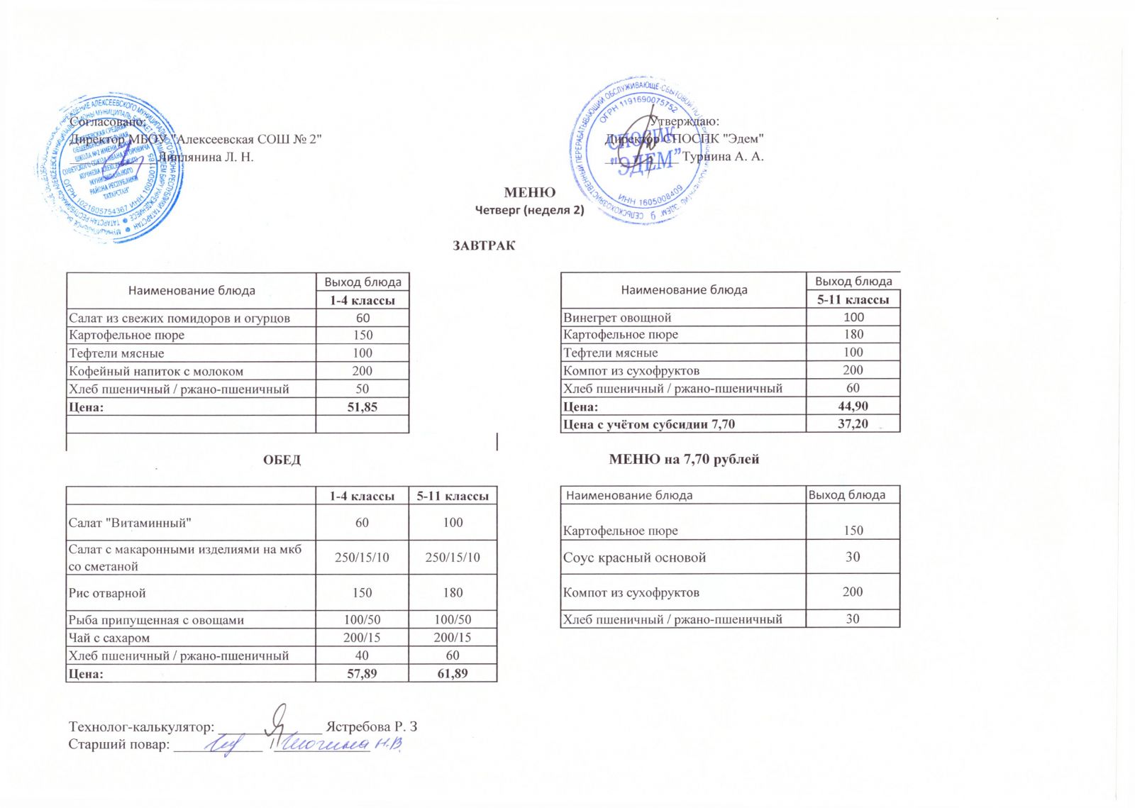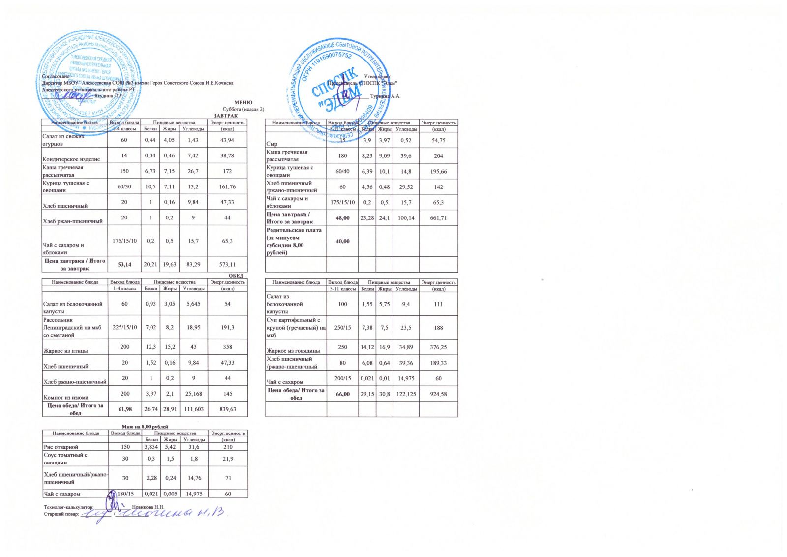 Меню МБОУ "Алексеевская СОШ №2" на 1 неделю