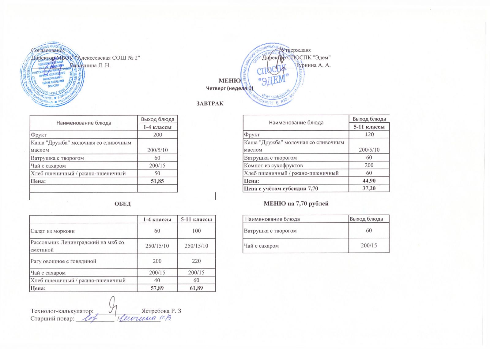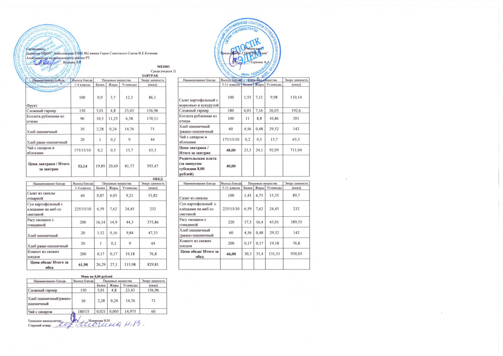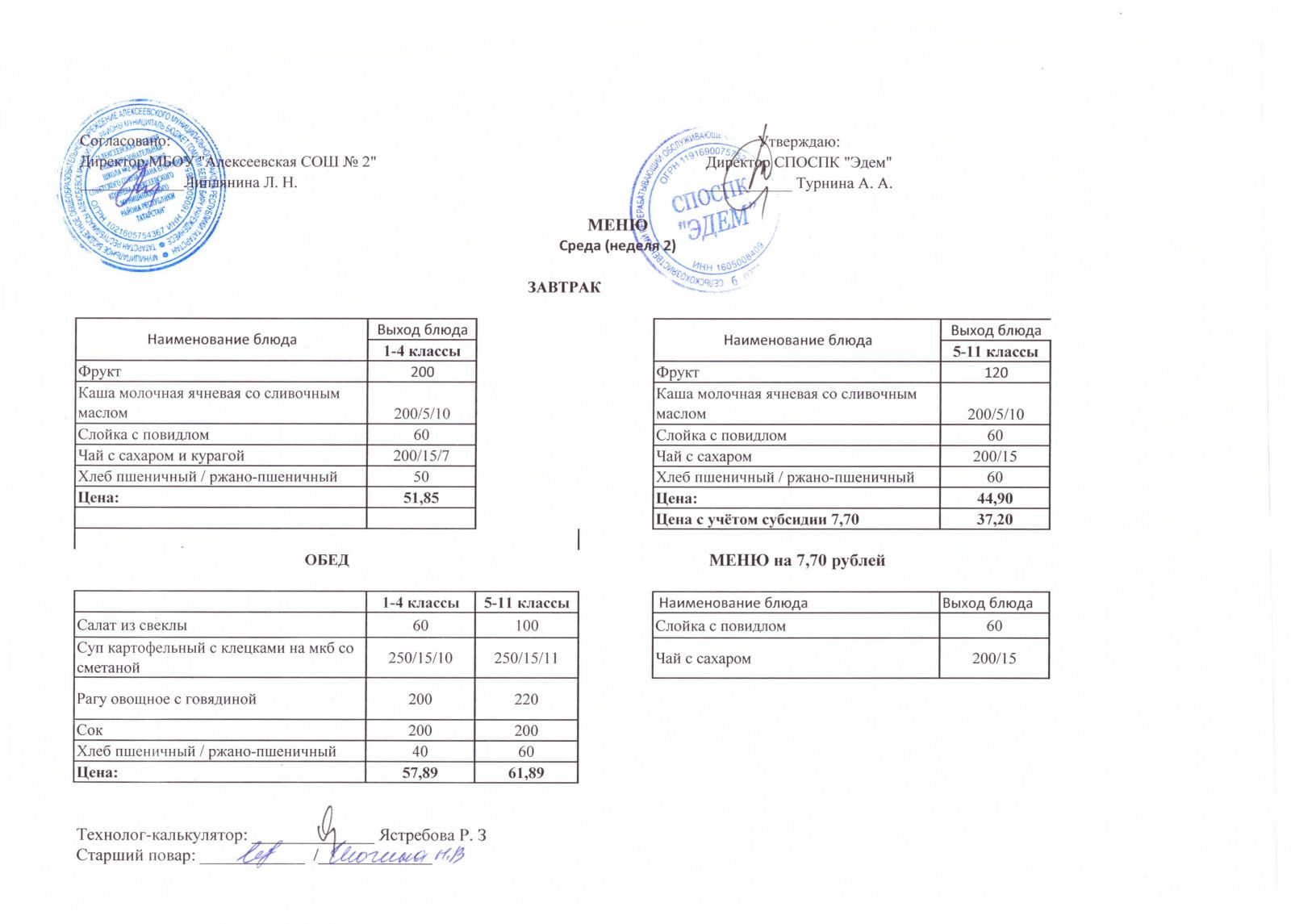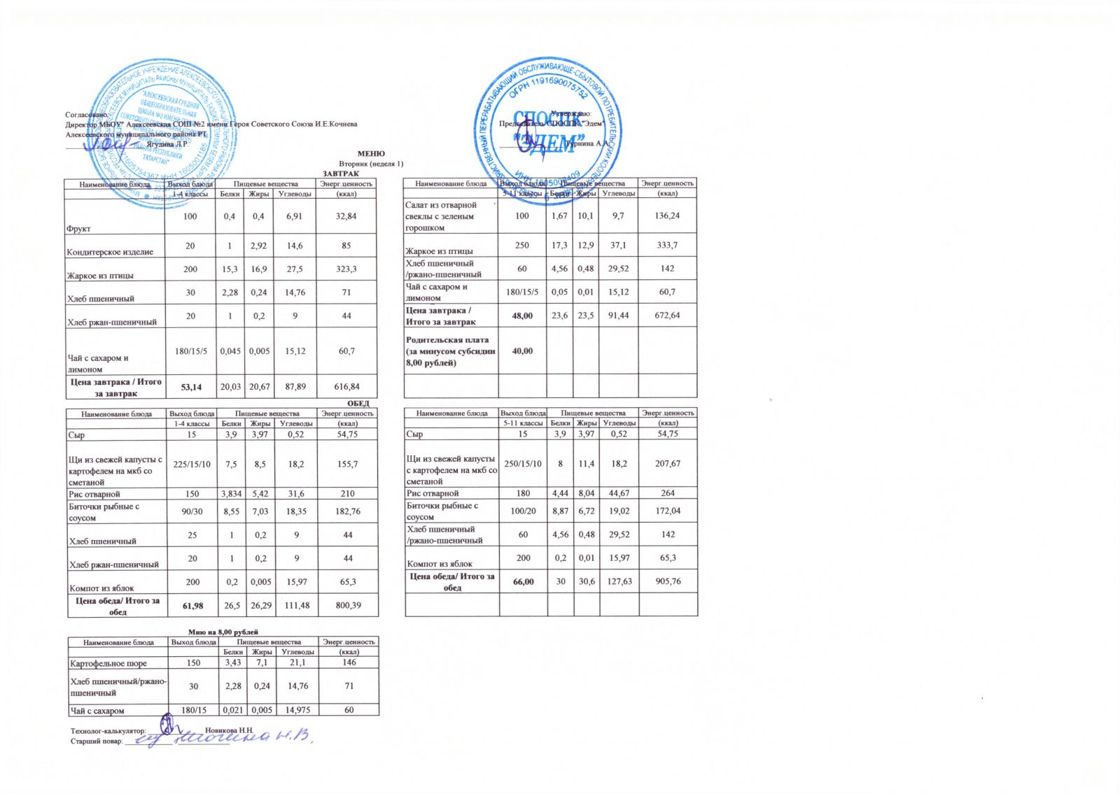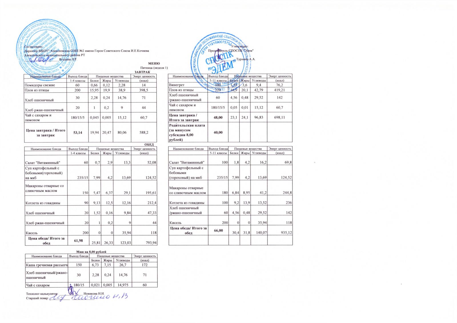 Меню МБОУ "Алексеевская СОШ №2" на 1 неделю