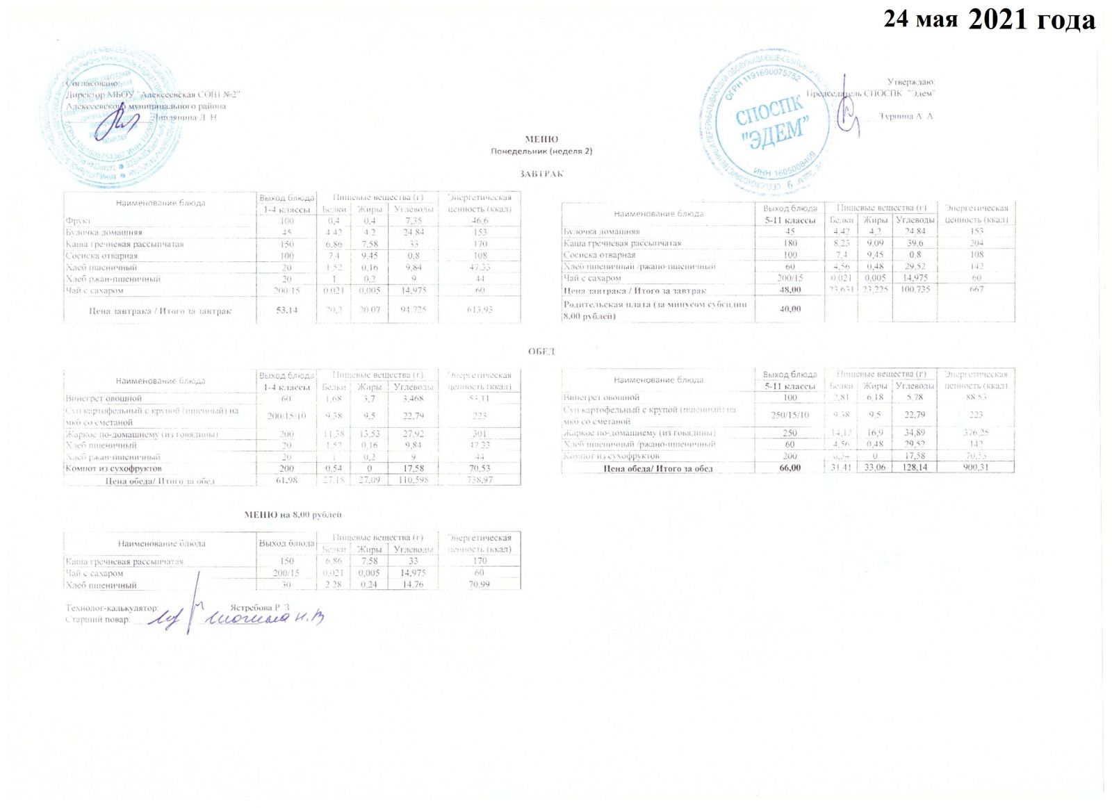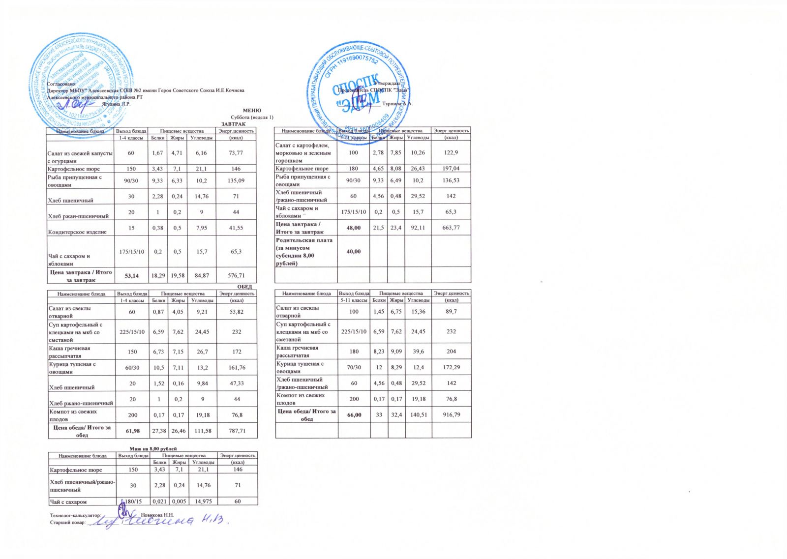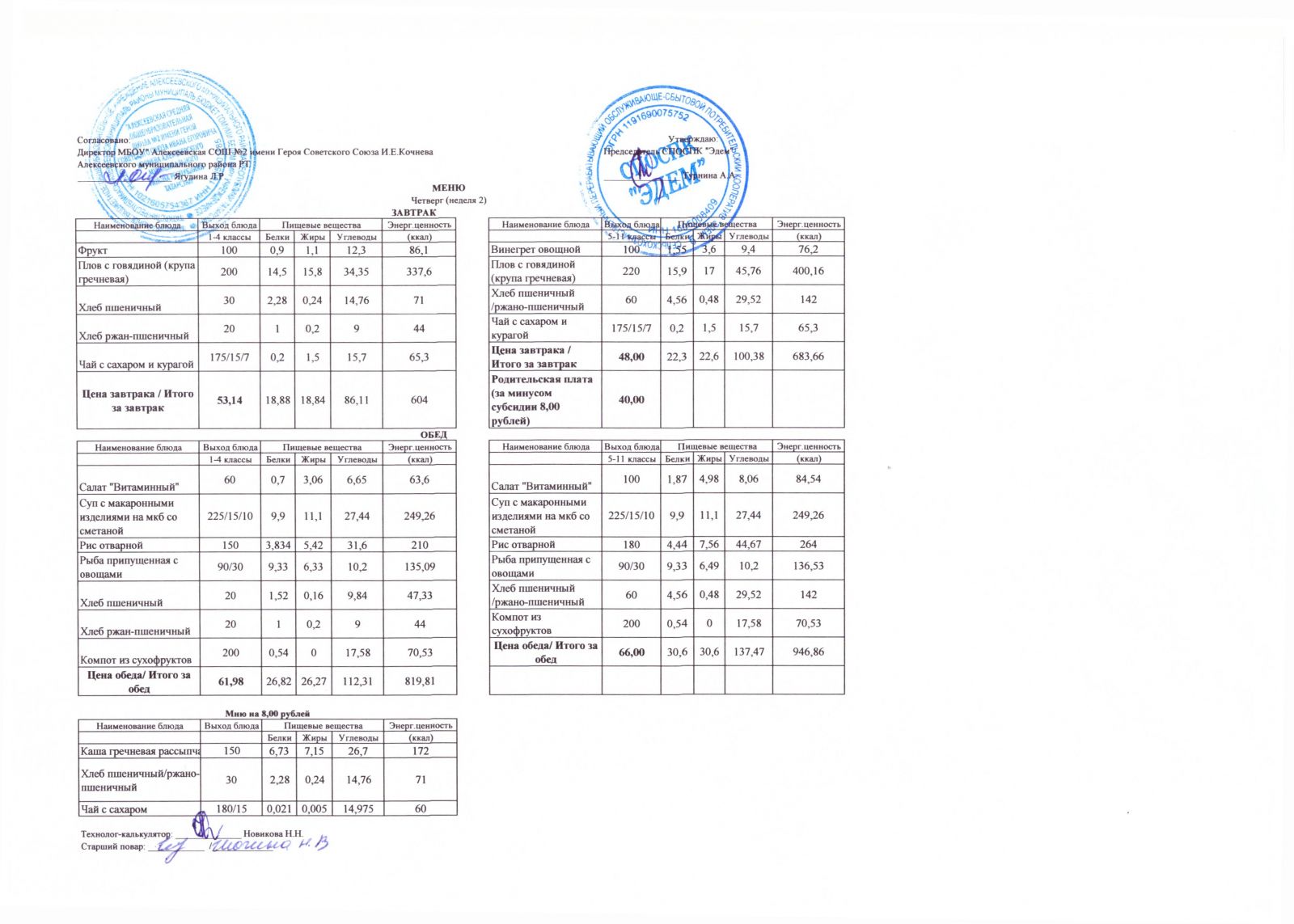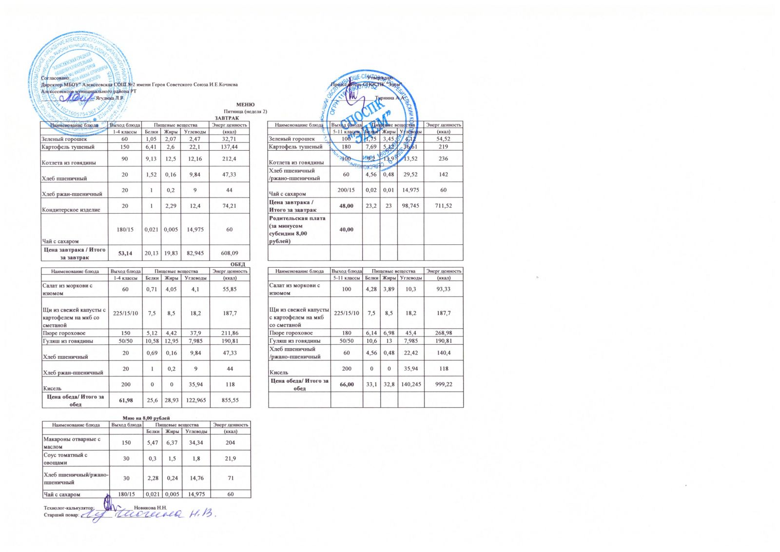 Меню МБОУ "Алексеевская СОШ №2" на 1 неделю