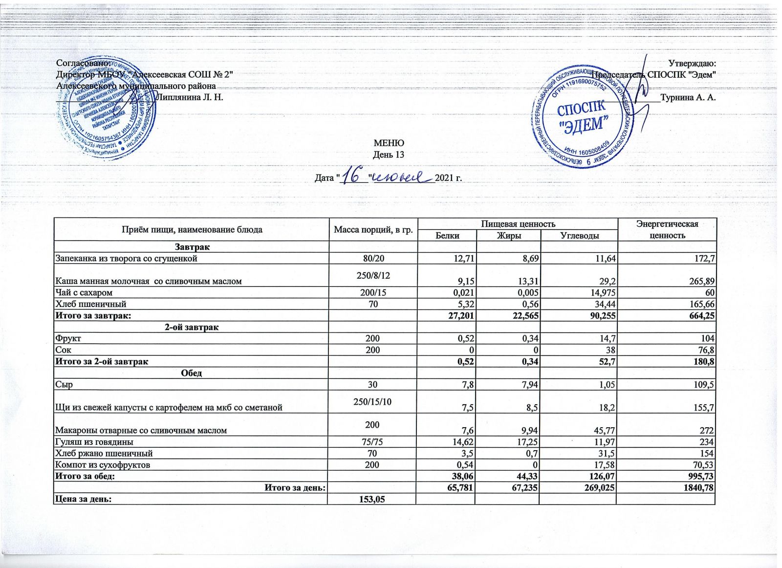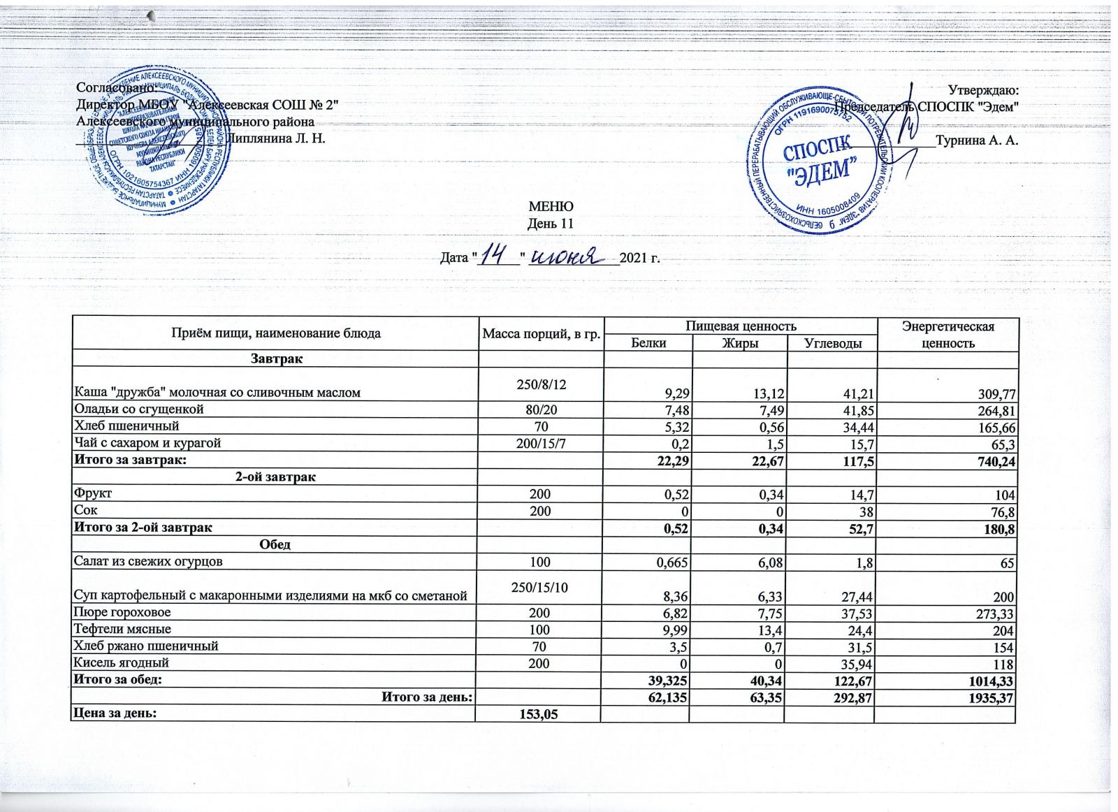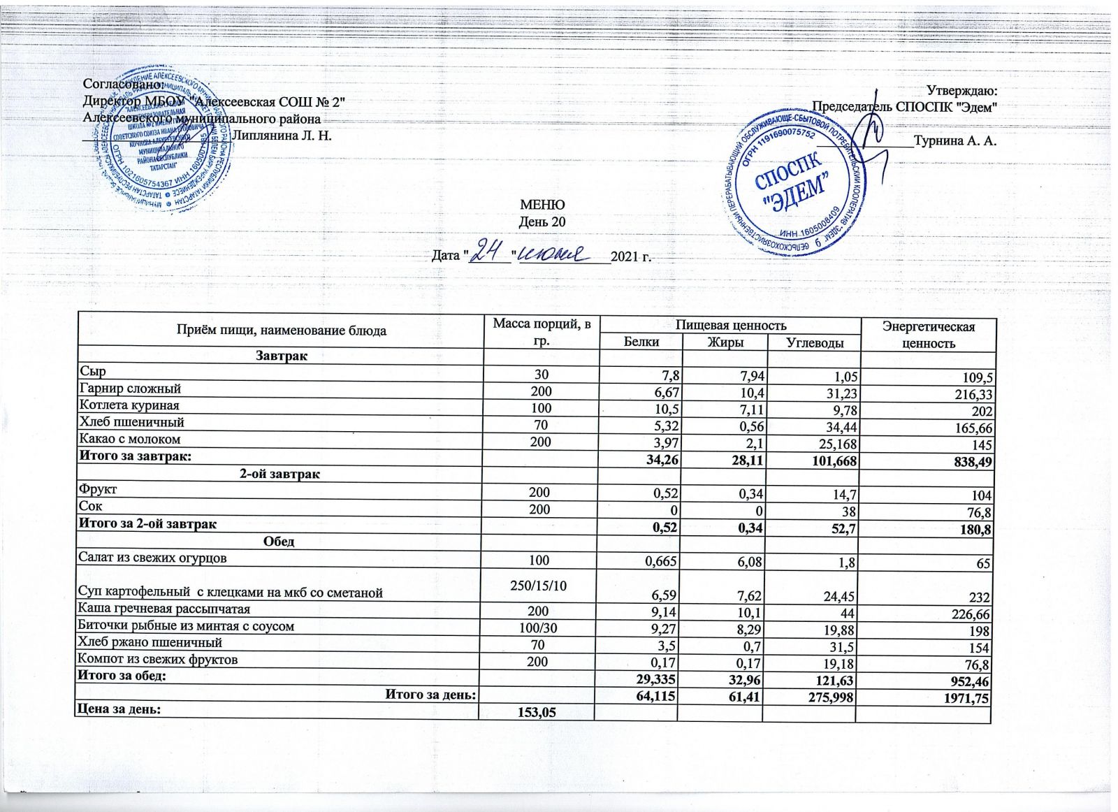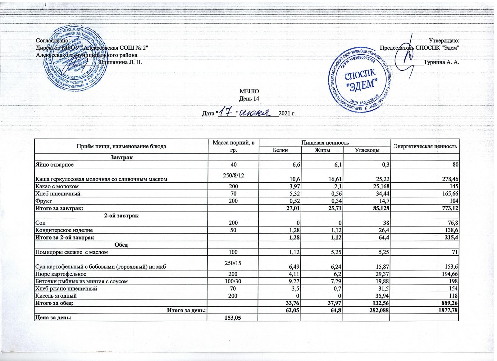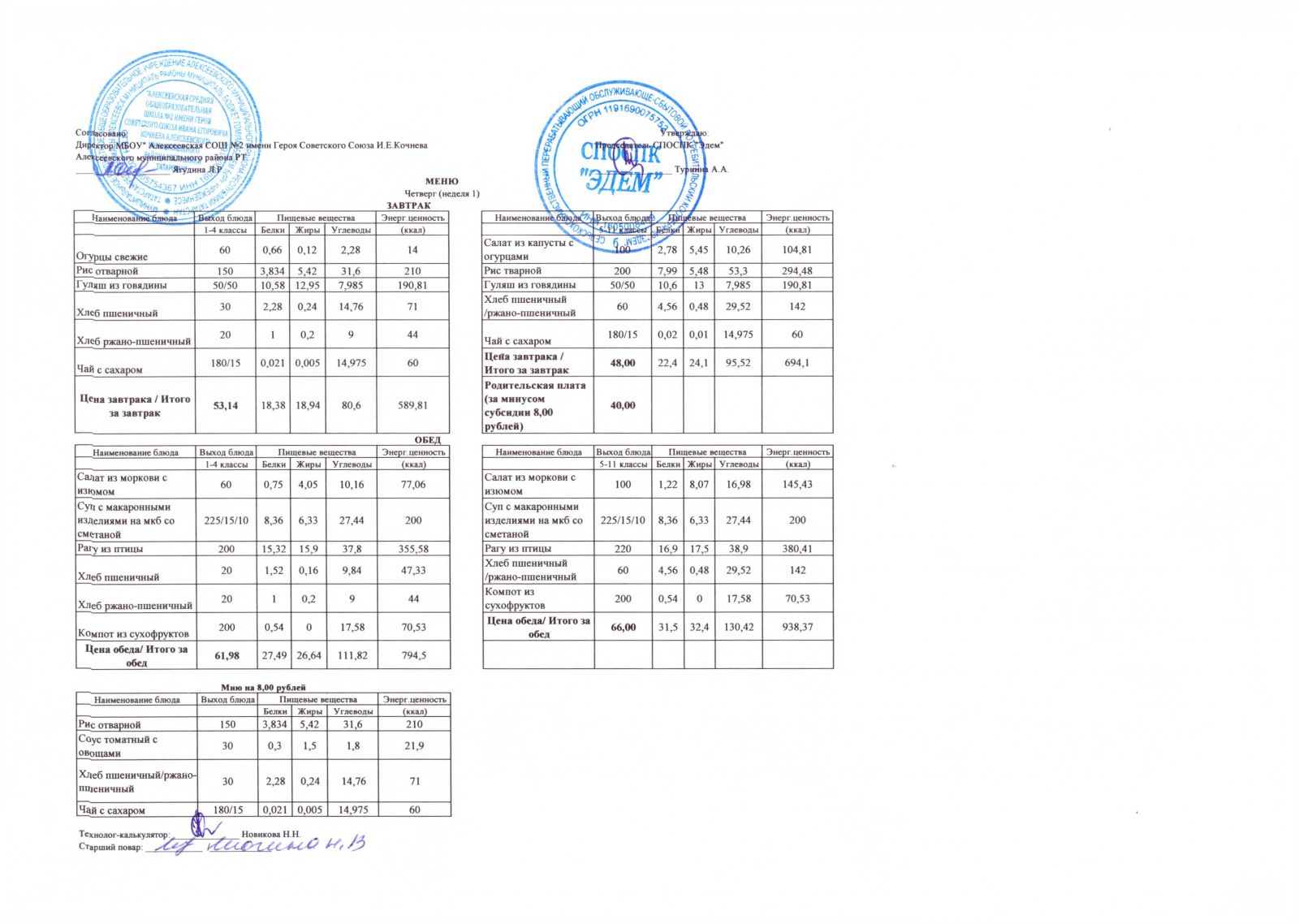 Меню МБОУ "Алексеевская СОШ №2" на 1 неделю