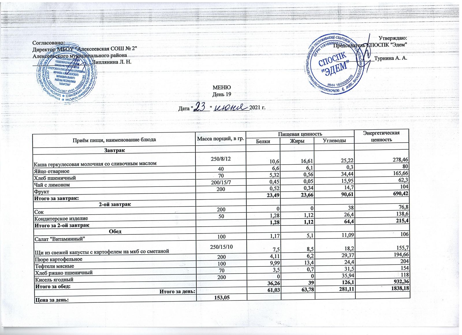 ОТЧЁТ по питанию в МБОУ "Алексеевская СОШ №2" на 19.06.2023 г.