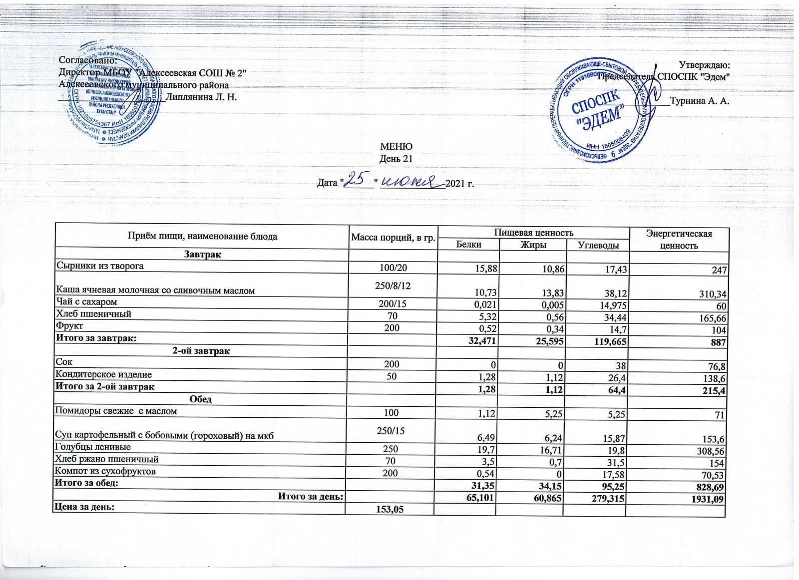 Меню 23.06.2021 Меню 24.06.2021 Меню 25.06.2021