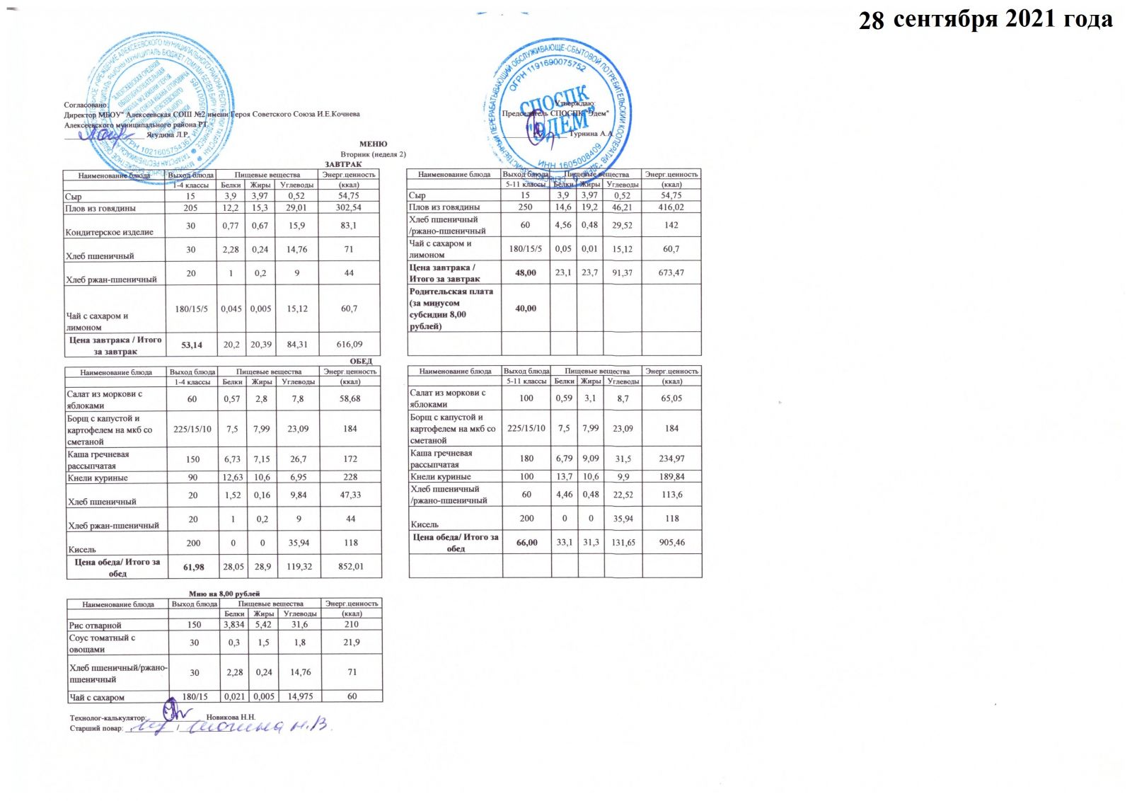 Меню 29.09.2021 Меню 30.09.2021