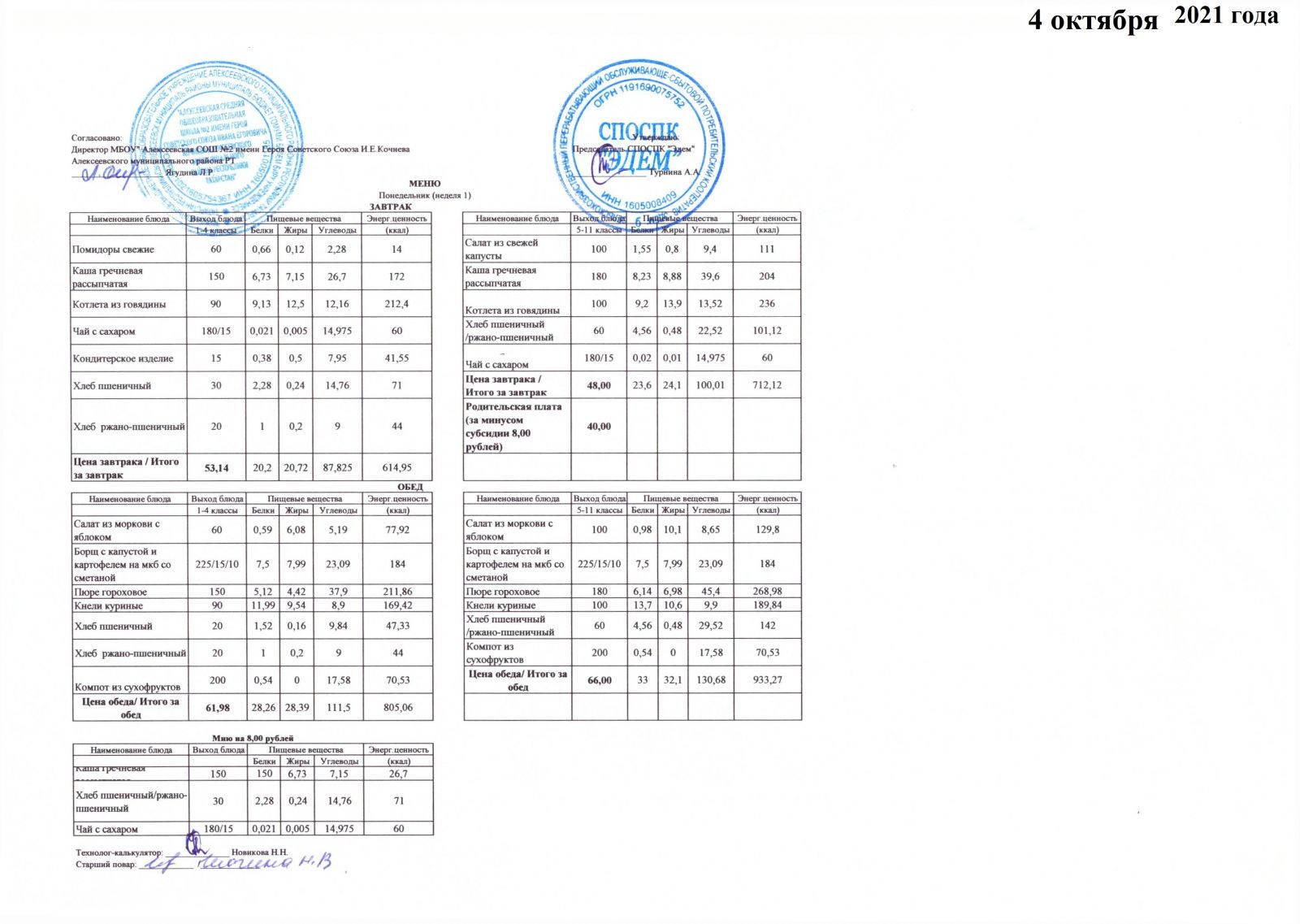 Примерное меню для 1-4 классов на 2021 год