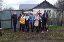 Волонтерский отряд оказывает помощь в уборке придомовой территории одинокой пенсионерке Карасевой В.Т.