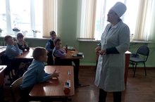 В рамках месячника школьная медсестра Вальщикова Э.А. ознакомила с профессиями врача и медицинской сестры учащихся 2б класса.