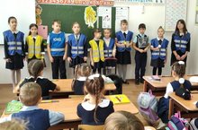 ЮИД агитбригадасы 1 сыйныф укучыларын фликерлар һәм яктылыкны кайтаручы элементлар куллану зарурлыгы турында нык ышандыра.