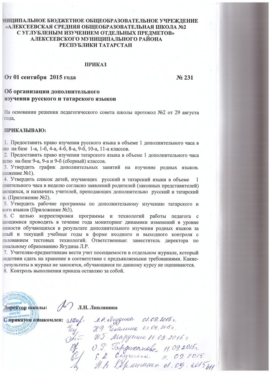 Приказ №231 от 01.09.2015 "Об организации дополнительного изучения русского и татарского языков"