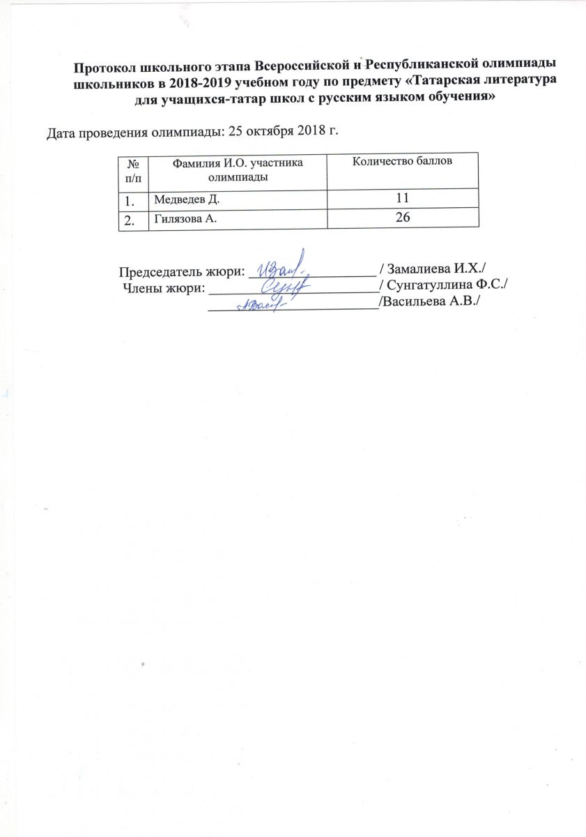 Протокол олимпиады по татарской литературе для учащихся-татар школ с русским языком обучения