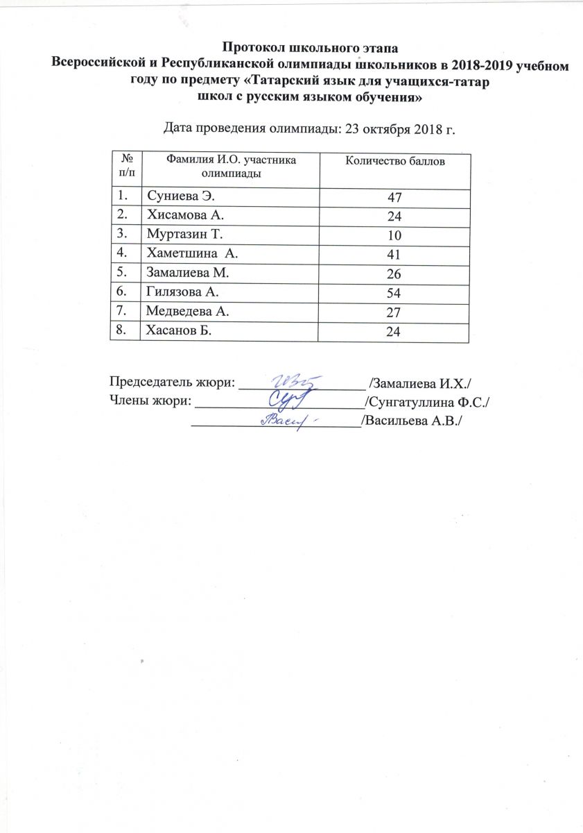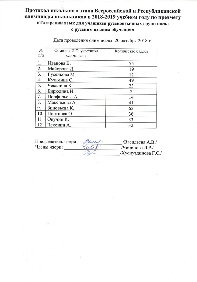 Протокол олимпиады по татарскому языку для учащихся-татар школ с русским языком обучения