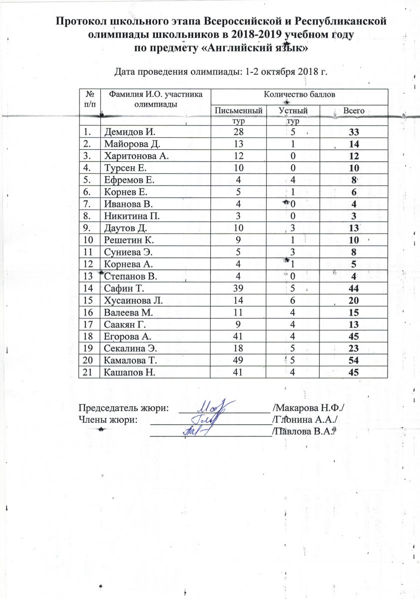 Протокол олимпиады по английскому языку