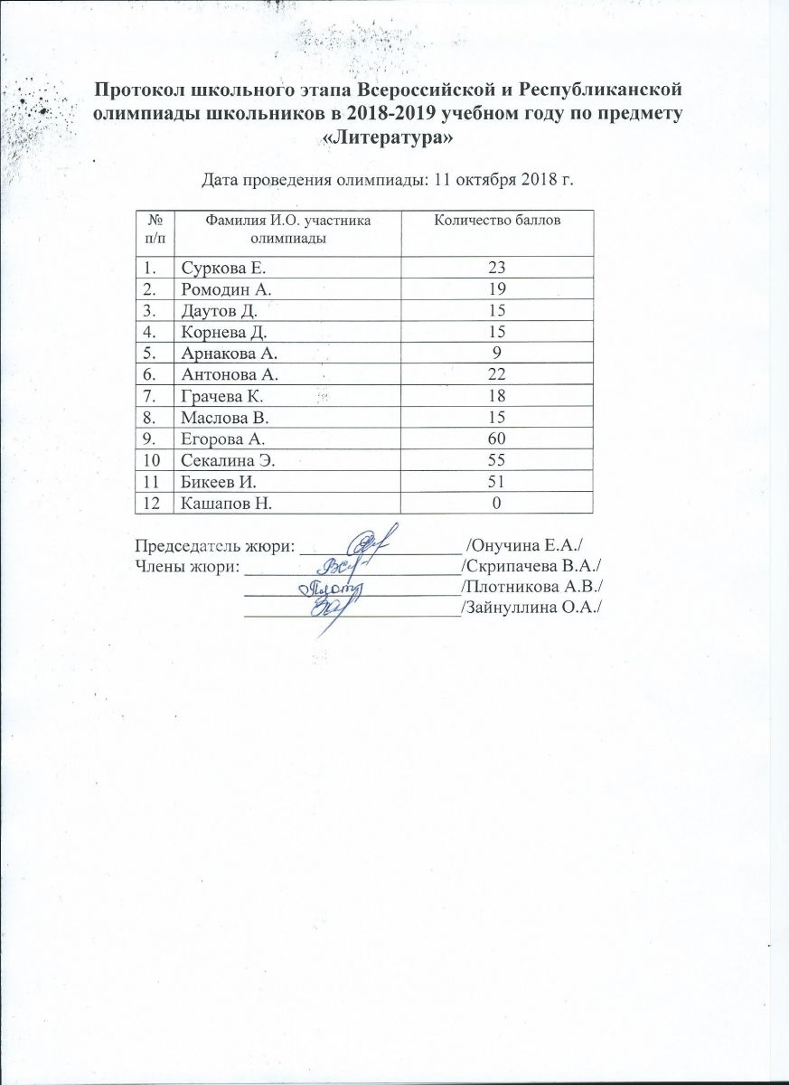 Протокол олимпиады по литературе