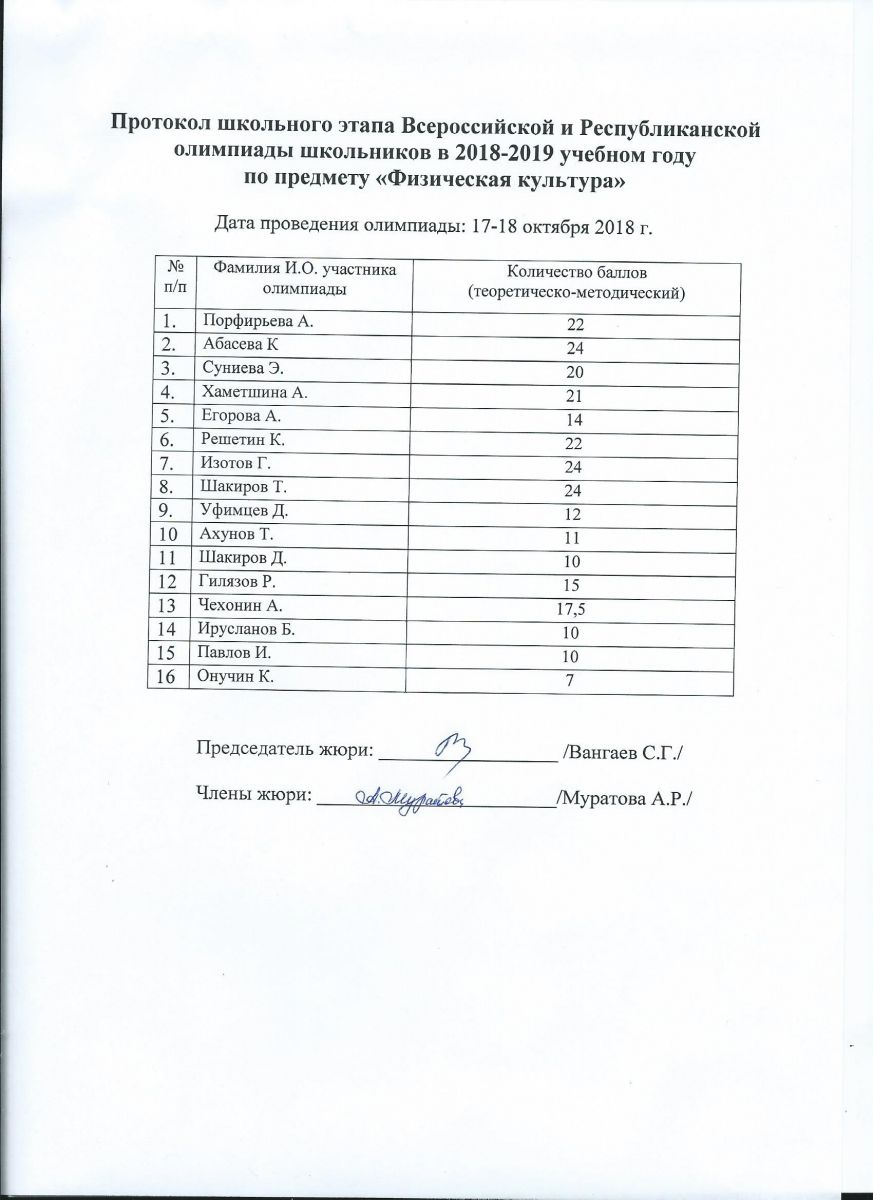 Протокол олимпиады по физической культуре
