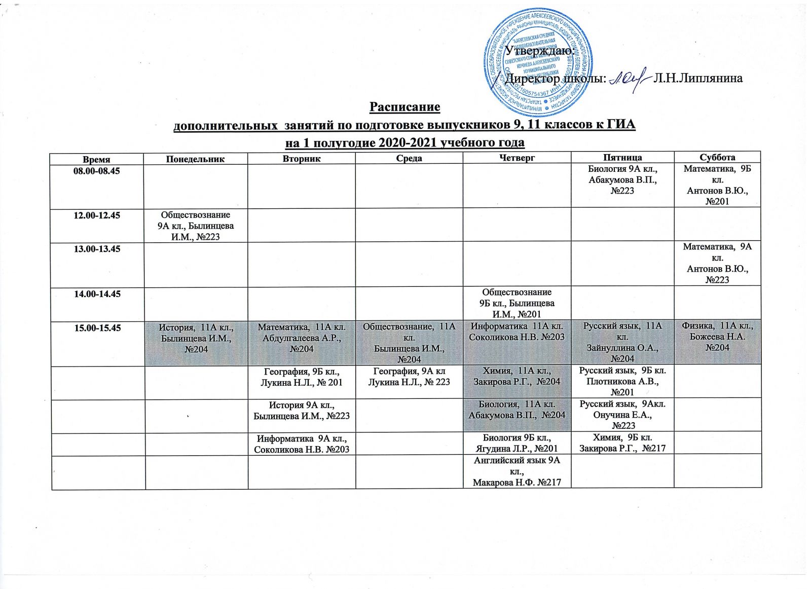 Расписание занятий по подготовке выпускников 9, 11 классов к ГИА 2020-2021 учебный год