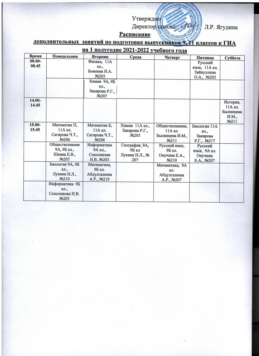 Расписание занятий по подготовке выпускников 9, 11 классов к ГИА 2021-2022 учебный год