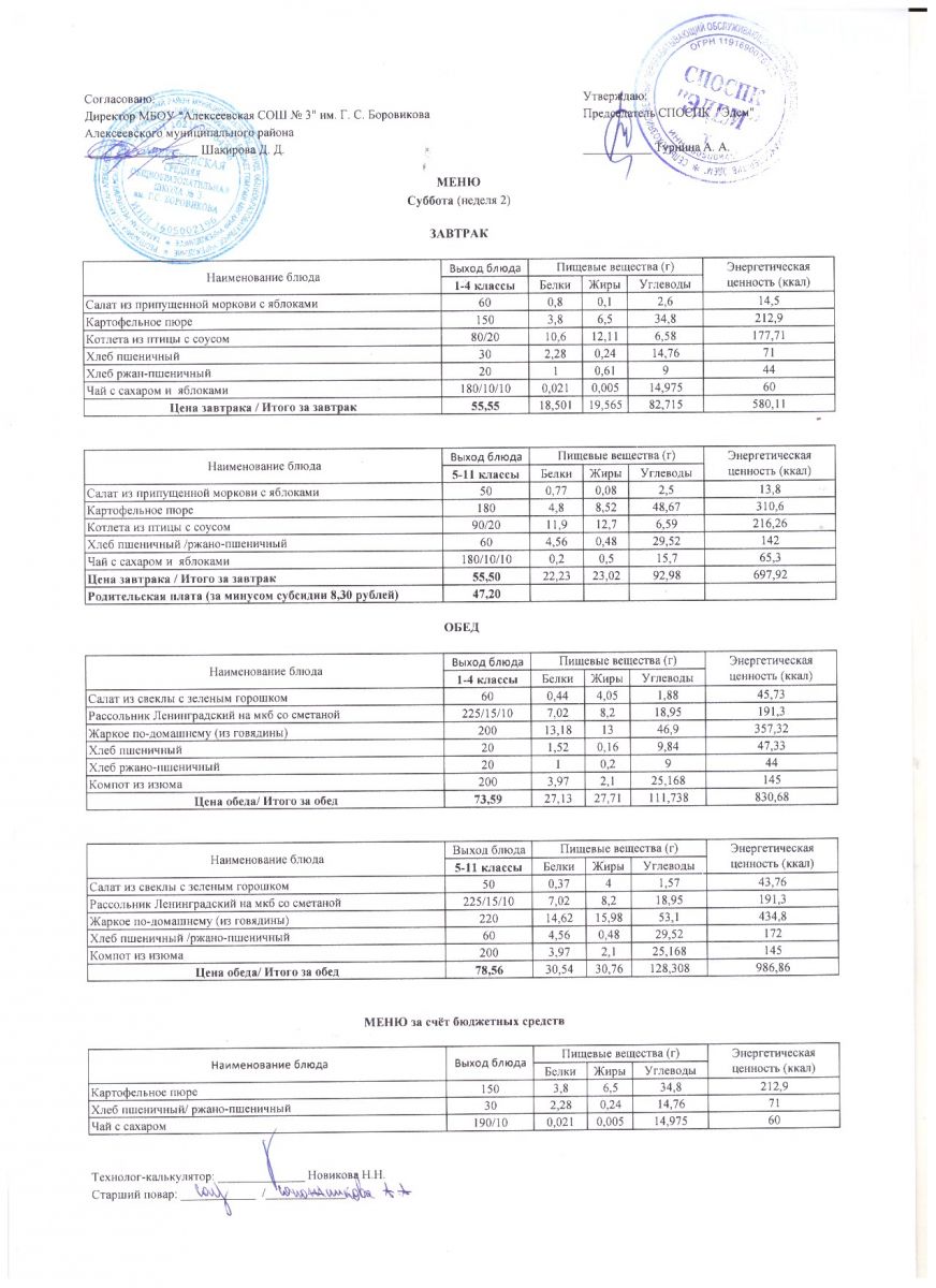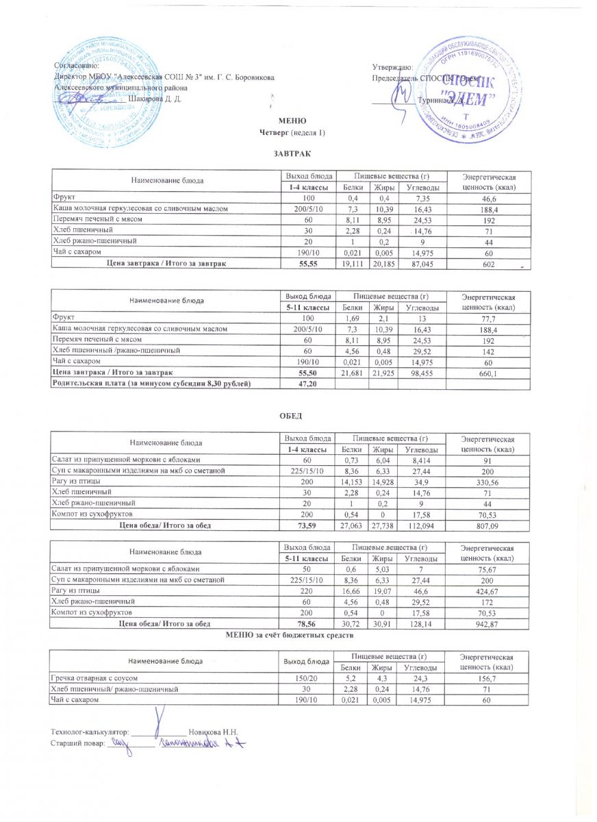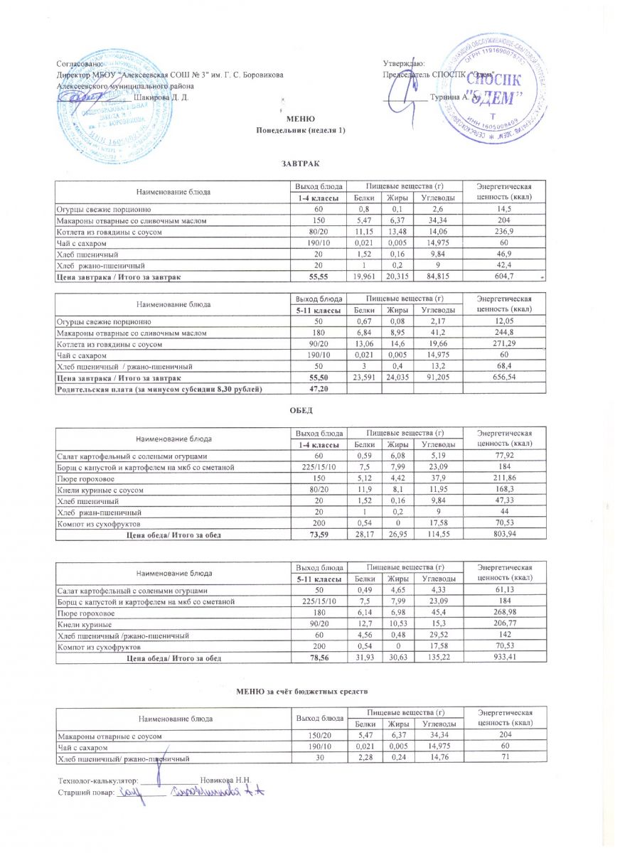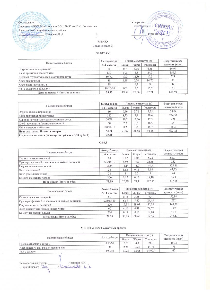 Примерное двухнедельное меню для учащихся 1-4 классов на I полугодие 2021-2022 учебного года