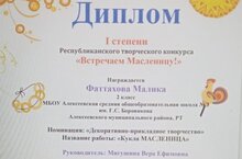 В феврале 2023 года проведен Республиканский творческий конкурс "Встречаем Масленицу". В данном конкурсе приняли учащиеся нашей школы. София Слобода ученица 3Б класса, по руководством Гаврюшовой Т. Ю., ученицы 2В класса Латифли Айлин, Фаттахова Малика, по руководством Мигушиной В. Е. Все девочки стали Победителями и награждены Дипломами 1 степени.