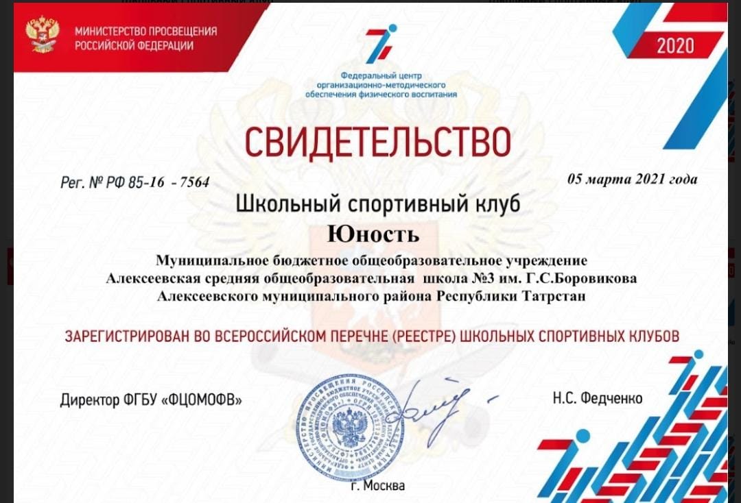 Свидетельство о регистрации во всероссийском перечне (реестре) школьных спортивных клубов