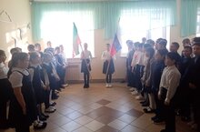 Понедельник учебной недели начинается с поднятия государственных флагов и исполнением государственного гимна./Дүшәмбе дәүләт флагларын күтәрү һәм дәүләт гимны башкару белән башлана.