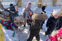 На прогулке дети младшей группы познакомились с интересными ледяными фигурами, сделанными для конкурса «Эколята», а также подкармливали зимующих птиц,насыпая в кормушки крошки хлеба. Дети получили большой заряд бодрости и хорошее настроение./Кече төркем балалары урамда «Эколята» боз сыннары белән таныштылар, шулай ук кошларга җим салдылар. Балаларның кәефе бик күтәренке иде.