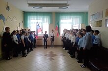 Новая учебная неделя началась с поднятия государственных флагов и исполнением государственного гимна./Яңа уку атнасы дәүләт флагларын күтәрү һәм дәүләт гимны башкару белән башланды.
