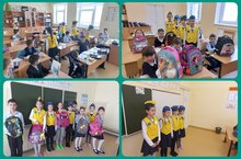 В преддверии осенних каникул отряд ЮИД выступил перед учащимися начальных классов с агитацией световозвращающих элементов../Көзге каникуллар алдыннан ЮИД отряды башлангыч сыйныф укучылары алдында яктылык кайтаручы элементлар агитациясе белән чыгыш ясады.