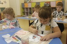 Сегодня в средней группе, под руководством воспитателя Шаровой М.В.прошло занятие по аппликации с элементами рисования. Тема занятия «Рябинка для снегиря». Дети создавали образ рябины с помощью приклеивание комочков бумаги. Закрепили знания о зимующих птицах./Бүген урта төркемдә, тәрбияче Шарова м.в. җитәкчелегендә, рәсем элементлары белән аппликация дәресе узды. Балалар миләш образын кәгазь төерләрен ябыштырып ясадылар. Кышлаучы кошлар турында белемнәрен ныгыттылар.