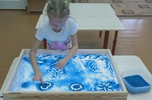 / Кинетик ком белән рәсем ясау баланың аң үсешен, иҗади сәләтен үстерә, кулларның вак моторикасын яхшырта, сөйләм үсешенә ярдәм итә, эмоциональ киеренкелекне төшерә, шатлыклы хисләр бүләк итә. Әлеге ком ярдәмендә матур пейзажлар ясарга мөмкин. Мәктәпкә әзерлек төркеме балалары көн режимында тәрбияче Власова Т.А. белән берлектә менә шуның белән шөгыльләнә дә инде. -