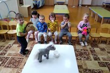 Дети группы раннего возраста на занятии развития речи с воспитательницей Хайбуллиной Р.Р. рассматривали и называли части тела игрушечной лошади, кормили, слушали про них потешку, в конце занятия катались на игрушечном коне. Детям было очень весело./Кече яшьтәге төркем балалары тәрбияче Хайбуллина Р.Р. белән сөйләмне үстерү дәресендә уенчык атыны карадылар, ашаттылар, алар турында сәяхәт тыңладылар, дәрес ахырында уенчык атында шудылар.