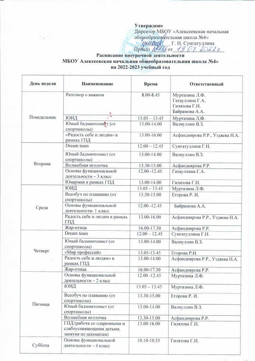 Расписание заняний внеурочной деятельности на 2022-2023 учебный год